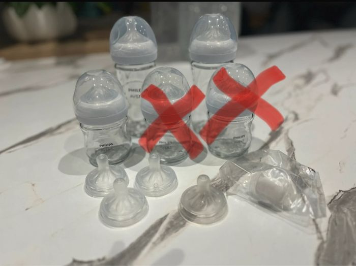 Je vends un ensemble de 1 biberons 125ml (vitesse 2) 2 biberons 260ml (vitesse 3) 2 tétines (vitesse 1) 2 tetines (vitesse 2) 1 Sucette Biberons en verre de la marque Philips Avent Natural Neuf, jamais servi.