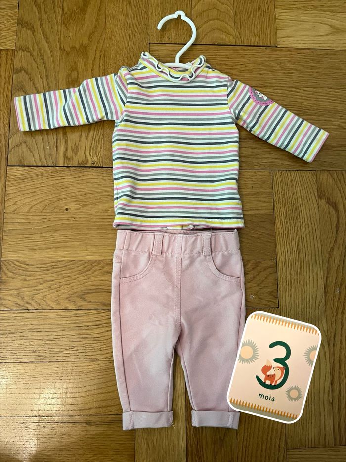 Ensemble fille tee-shirt rayé à manches longues et pantalon style jean. Motif Disney Marie (les Aristochats) sur le tee-shirt, taille 3 mois.