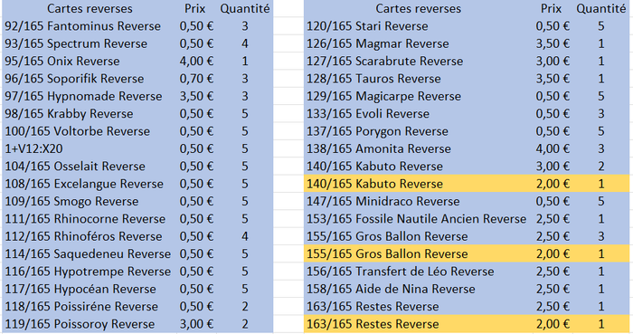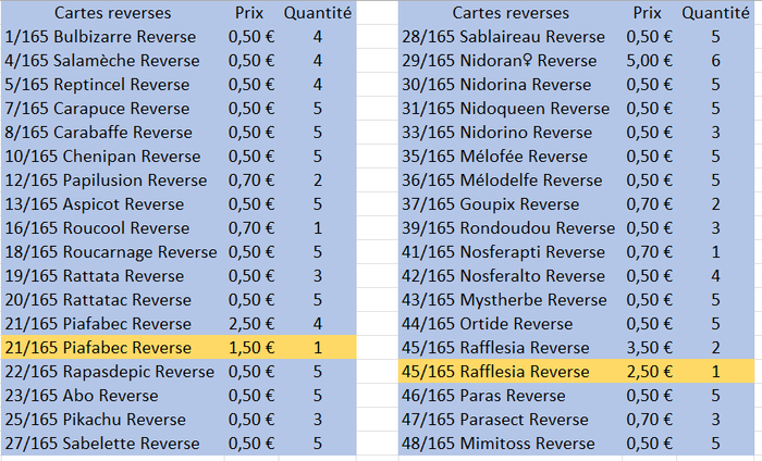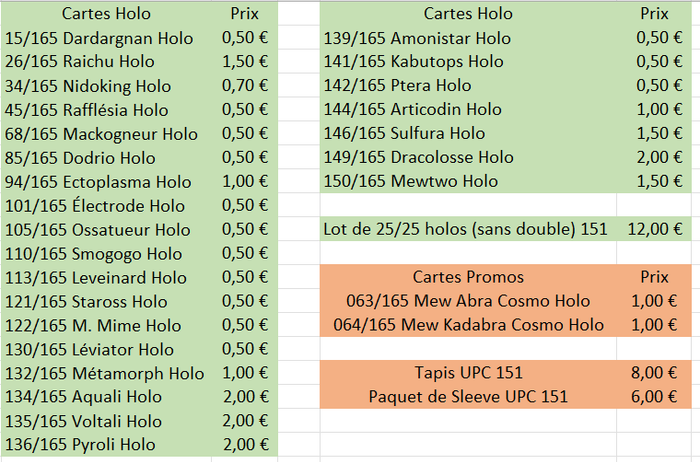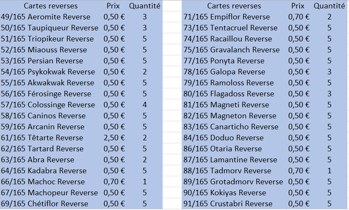 Bonjour, Je propose à la vente des cartes Pokémon Ex, Reverse et Holo de la très recherchée série 151 ! Idéales pour compléter votre collection ou renforcer votre deck, ces cartes sont en excellent état. ✨ Détails : • Cartes issues de la série Pokémon 151 • Versions Reverse et Holo • Plusieurs exemplaires disponibles, photos sur demande • Etat : Excellent (sauf les cartes en jaune qui sont en bon état) • Prix : SUR LES PHOTOS DE L’ANNONCE Disponibilité : Reverses : 1/165 Bulbizarre Reverse 4/165 Salamèche Reverse 5/165 Reptincel Reverse 7/165 Carapuce Reverse 8/165 Carabaffe Reverse 10/165 Chenipan Reverse 12/165 Papilusion Reverse 13/165 Aspicot Reverse 16/165 Roucool Reverse 18/165 Roucarnage Reverse 19/165 Rattata Reverse 20/165 Rattatac Reverse 21/165 Piafabec Reverse 21/165 Piafabec Reverse 22/165 Rapasdepic Reverse 23/165 Abo Reverse 25/165 Pikachu Reverse 27/165 Sabelette Reverse 28/165 Sablaireau Reverse 29/165 Nidoran♀ Reverse 30/165 Nidorina Reverse 31/165 Nidoqueen Reverse 33/165 Nidorino Reverse 35/165 Mélofée Reverse 36/165 Mélodelfe Reverse 37/165 Goupix Reverse 39/165 Rondoudou Reverse 41/165 Nosferapti Reverse 42/165 Nosferalto Reverse 43/165 Mystherbe Reverse 44/165 Ortide Reverse 45/165 Rafflesia Reverse 45/165 Rafflesia Reverse 46/165 Paras Reverse 47/165 Parasect Reverse 48/165 Mimitoss Reverse 49/165 Aeromite Reverse 50/165 Taupiqueur Reverse 51/165 Triopikeur Reverse 52/165 Miaouss Reverse 53/165 Persian Reverse 54/165 Psykokwak Reverse 55/165 Akwakwak Reverse 56/165 Férosinge Reverse 57/165 Colossinge Reverse 58/165 Caninos Reverse 59/165 Arcanin Reverse 61/165 Têtarte Reverse 62/165 Tartard Reverse 63/165 Abra Reverse 64/165 Kadabra Reverse 66/165 Machoc Reverse 67/165 Machopeur Reverse 69/165 Chétiflor Reverse 71/165 Empiflor Reverse 73/165 Tentacruel Reverse 74/165 Racaillou Reverse 75/165 Gravalanch Reverse 77/165 Ponyta Reverse 78/165 Galopa Reverse 79/165 Ramoloss Reverse 80/165 Flagadoss Reverse (Suite en photo)