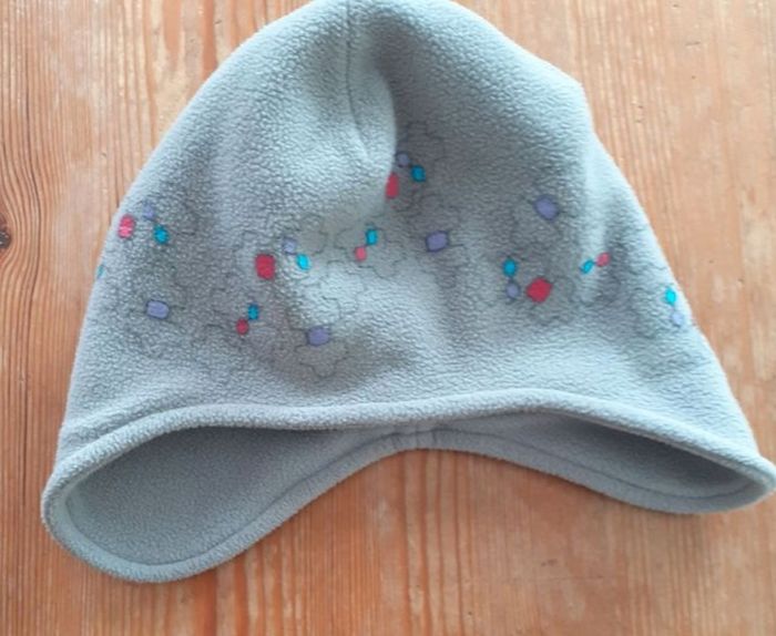 Je vends ce bonnet polaire et doublé de couleur grise avec de petits motifs colorés.