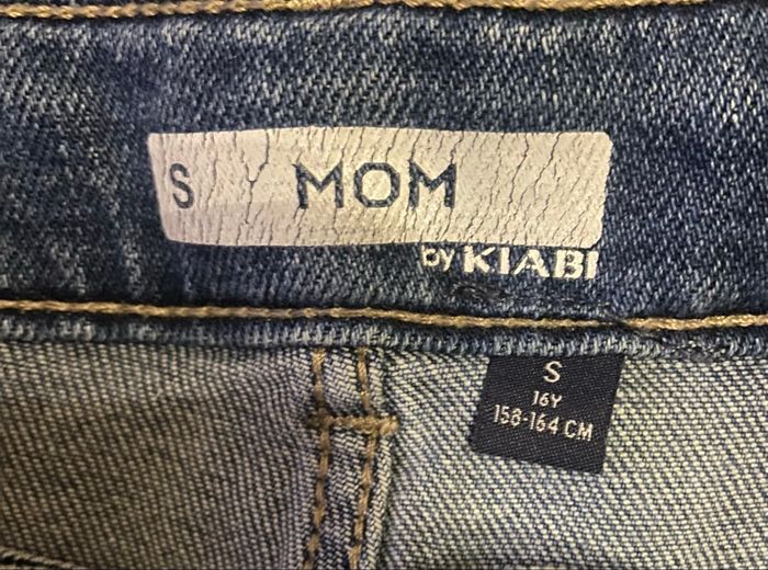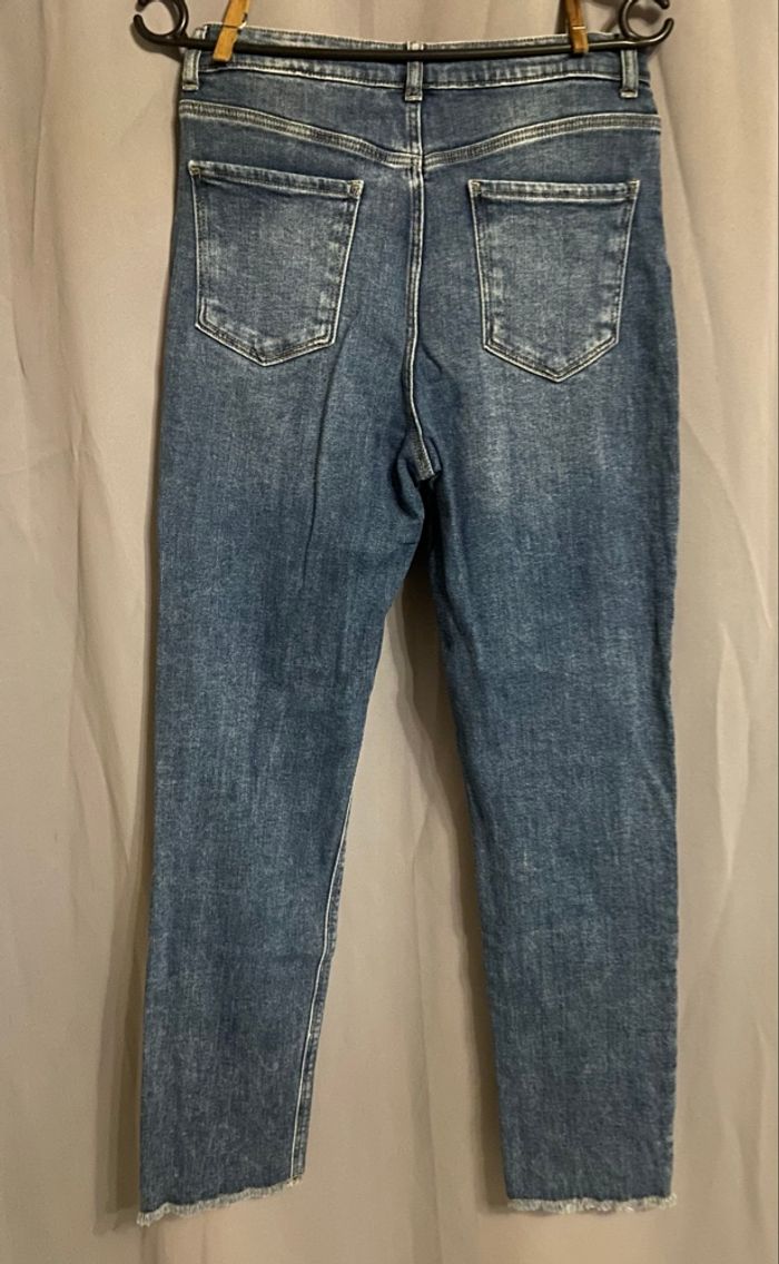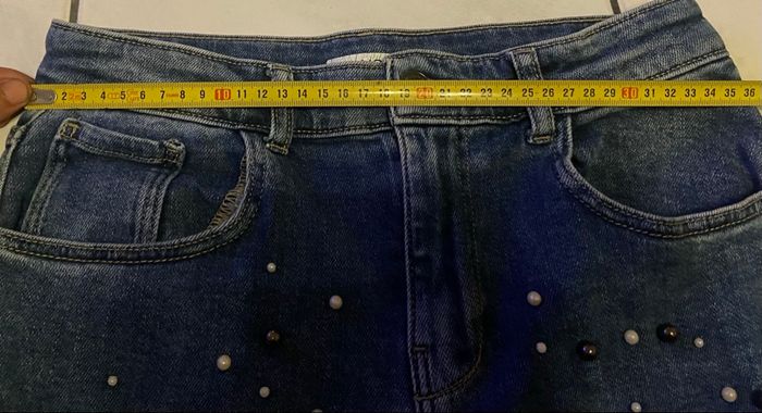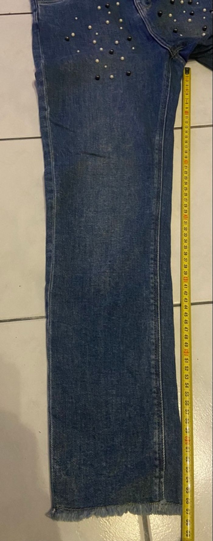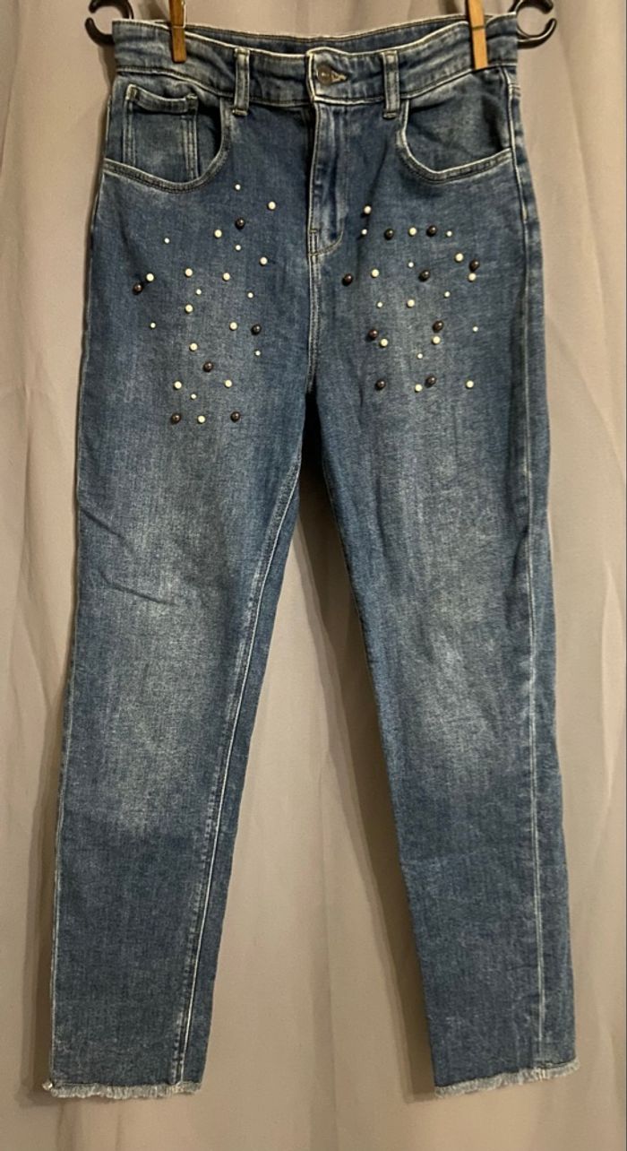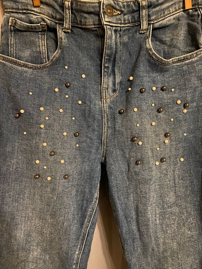 Jean bleu »Kiabi »avec perles nacrées et grises coupe slim,la taille est ajustable par des élastiques,taille S en très bon état.