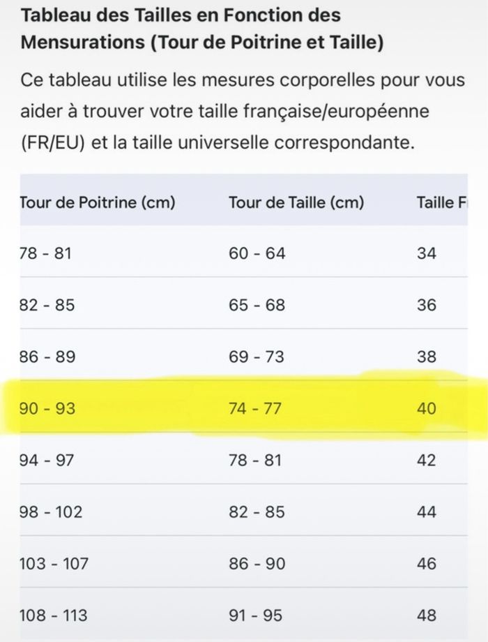 Mesure d’aisselles à aisselles:45,5cm=91cm de tour de poitrine.