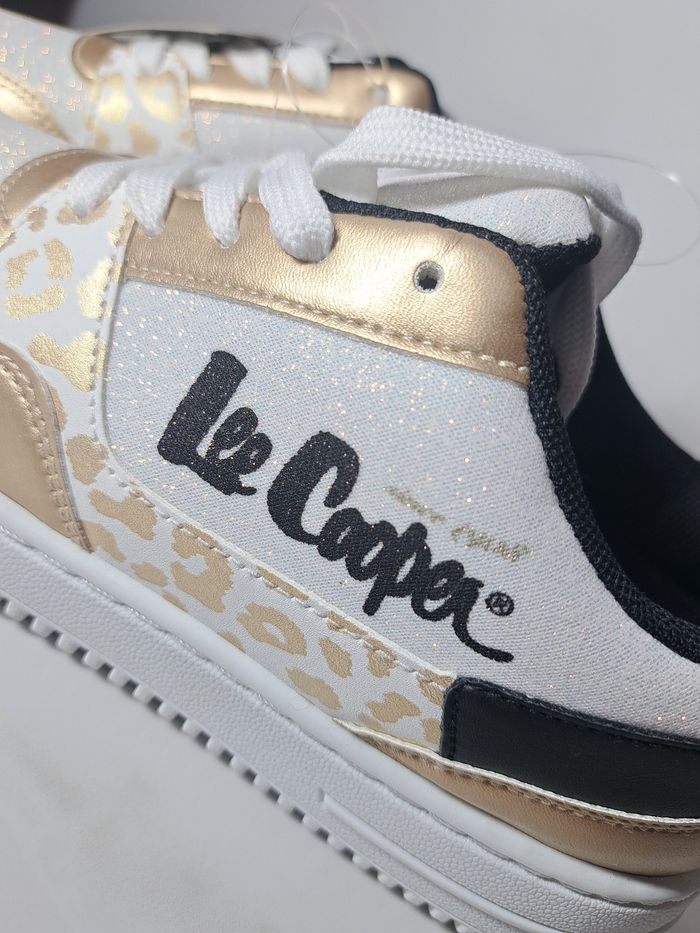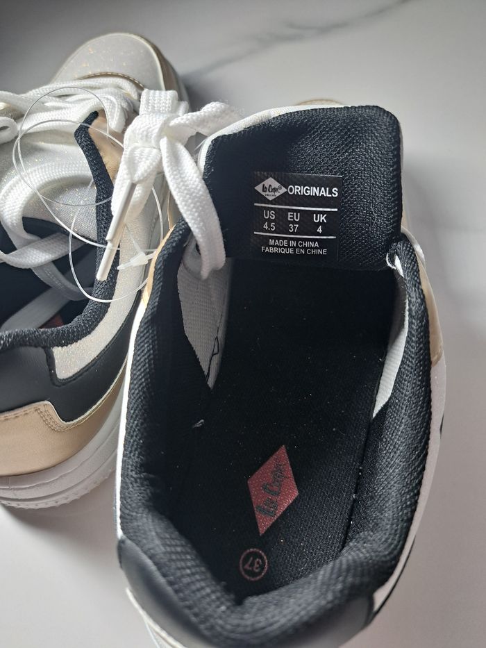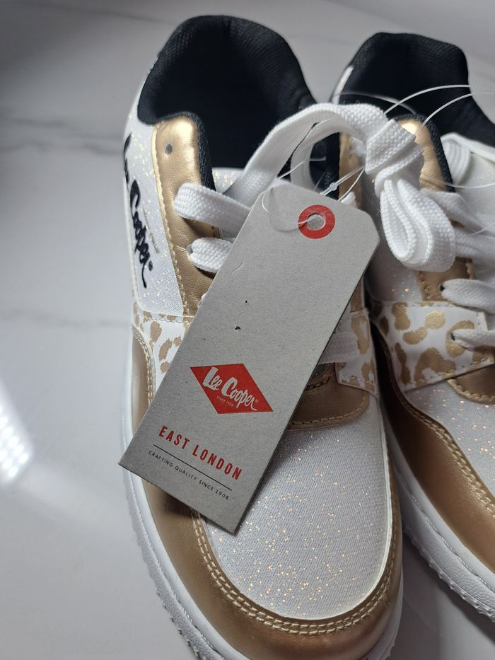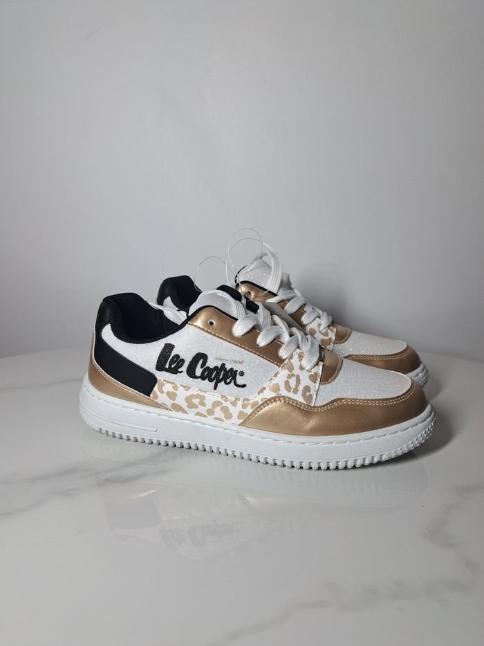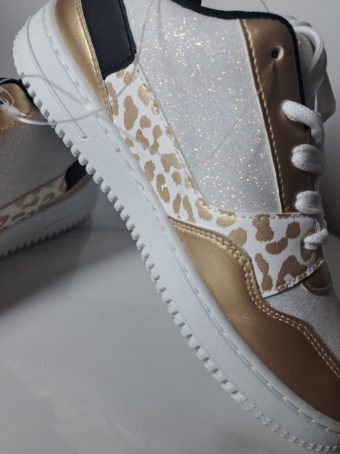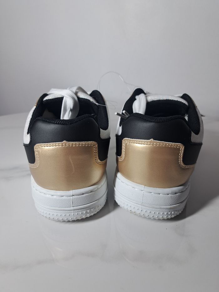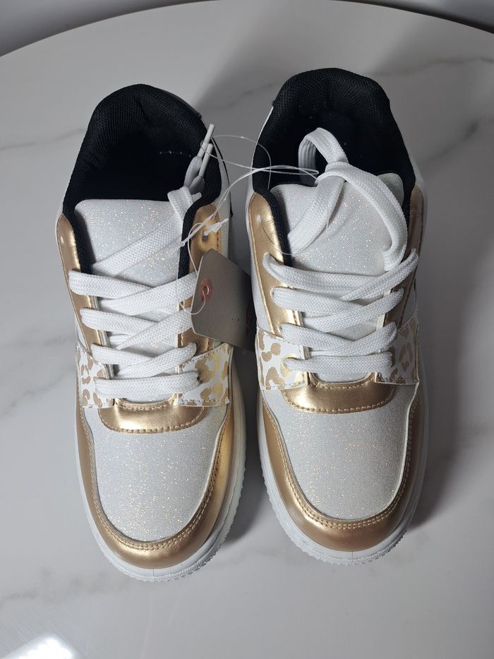 Jolie paire de baskets femme au design élégant et moderne, mélange de blanc, doré et noir avec détails imprimés.