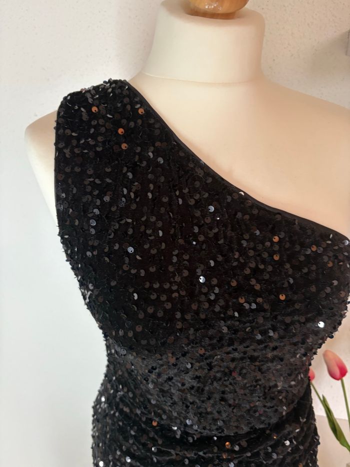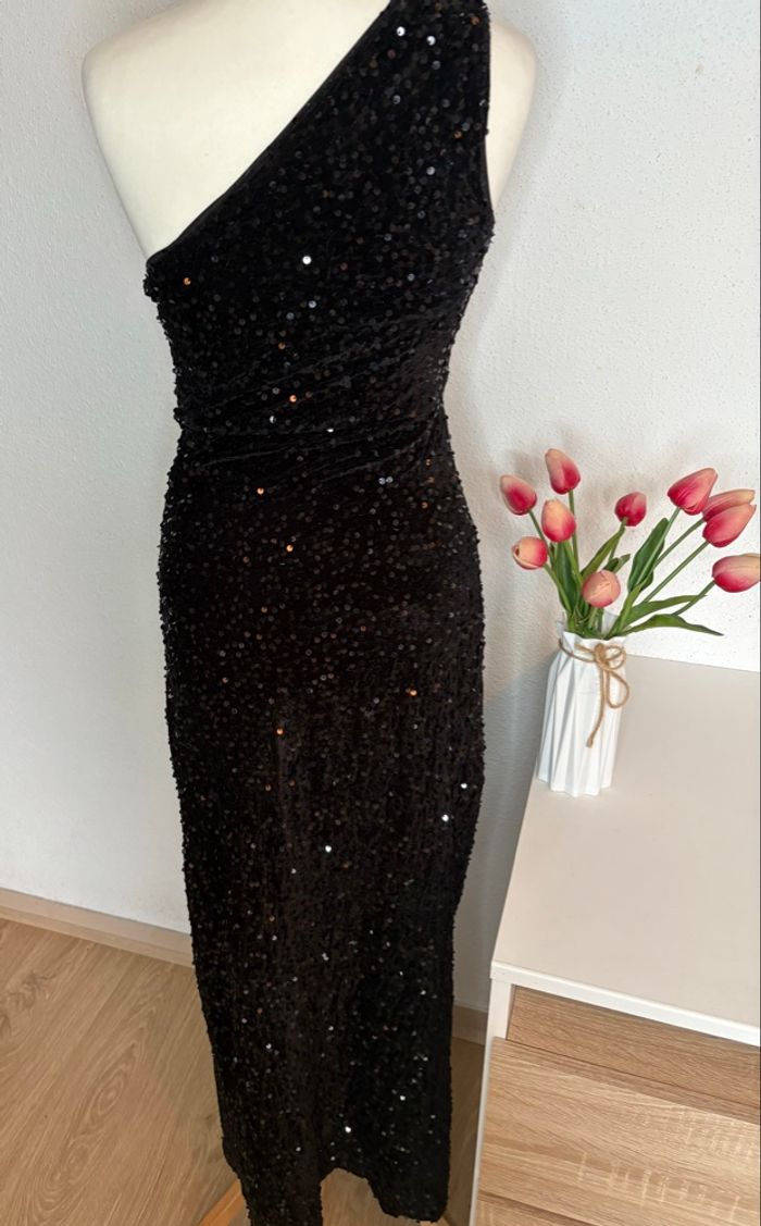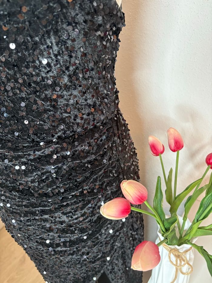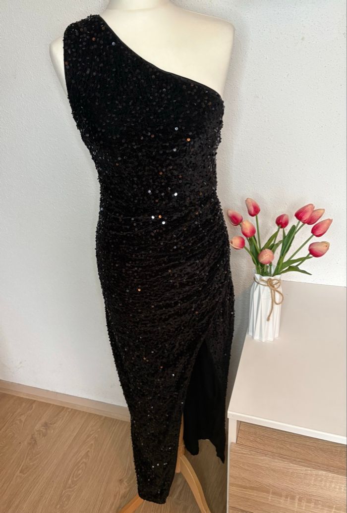 Robe longue noire à sequins – Asymétrique, fente élégante.