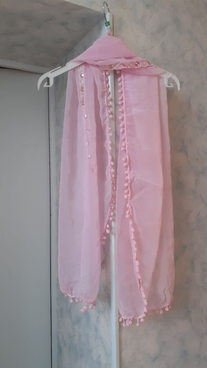 Vends une écharpe en voile rose avec paillettes et pompons.