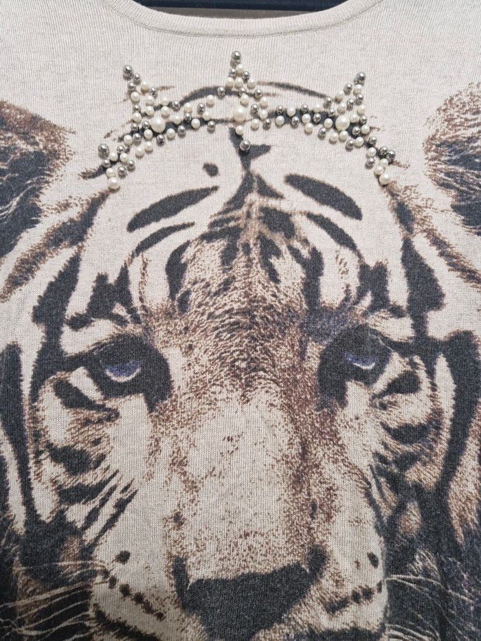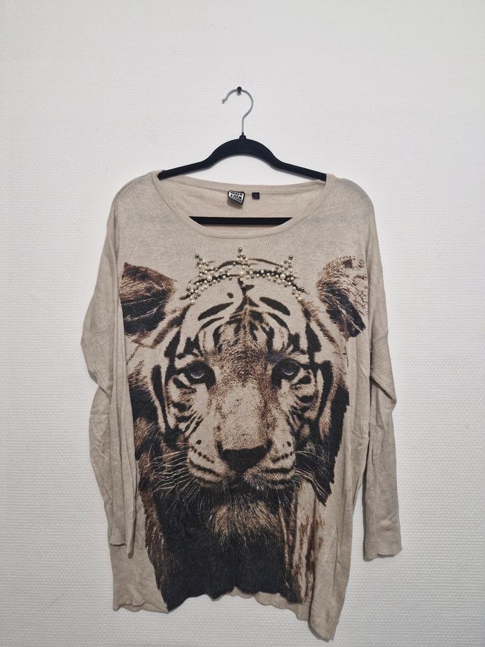 Je vends ce pull fin en maille beige avec un motif imprimé d'un tigre couronné.