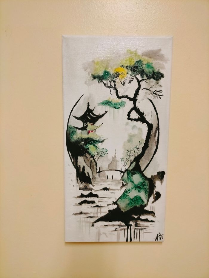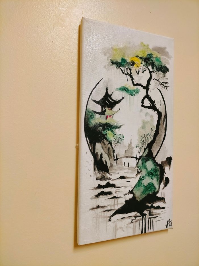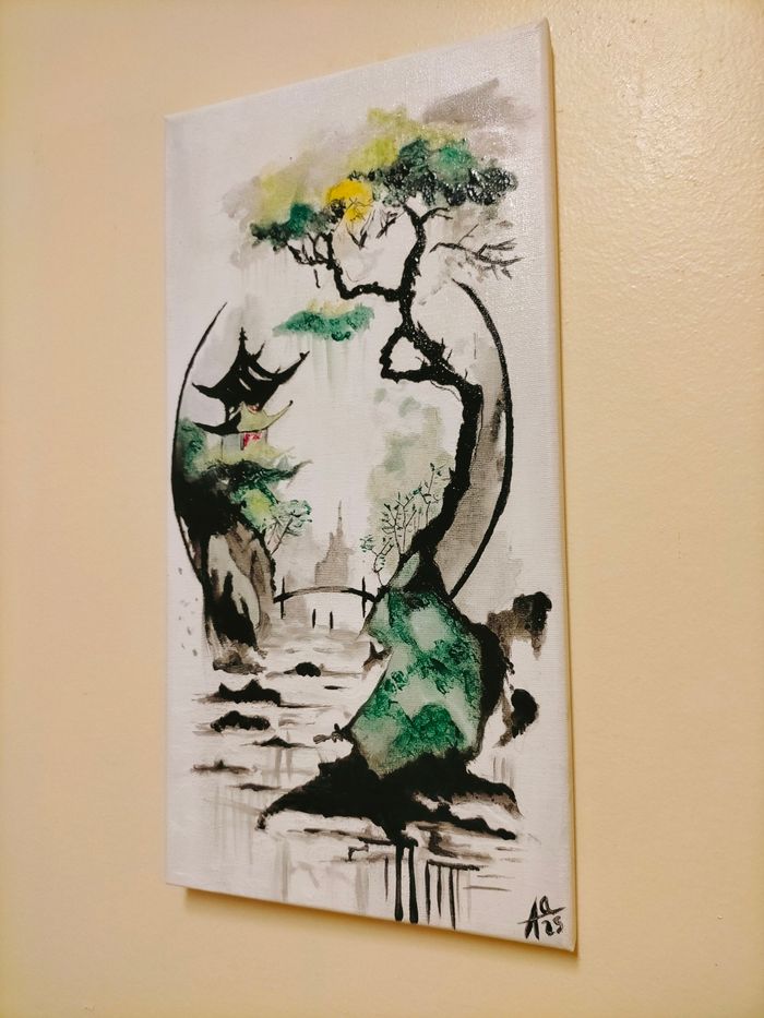 Cette peinture réalisée à l'acrylique sur toile, représente un paysage d’inspiration asiatique où se mêlent sérénité et poésie. Au centre, un arbre aux lignes courbes évoque l’équilibre naturel, tandis qu’un pavillon traditionnel se dresse sur une falaise verdoyante. En arrière-plan, un pont délicat et des silhouettes architecturales suggèrent un village enveloppé de brume.