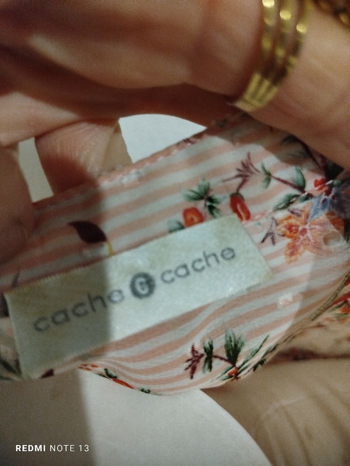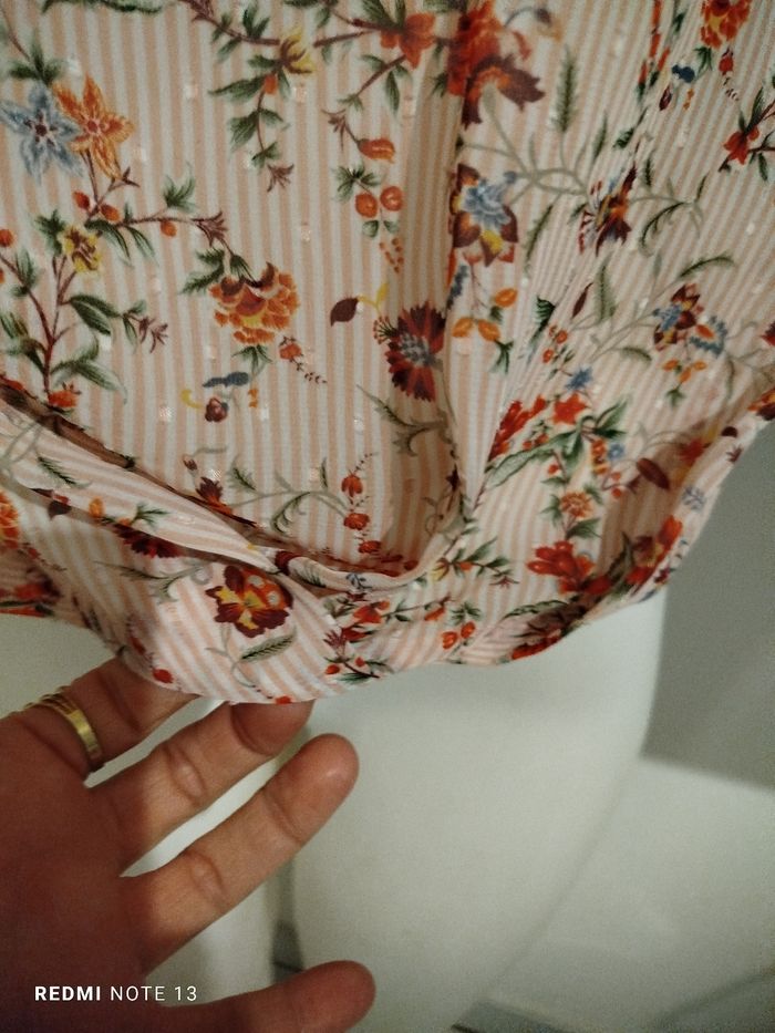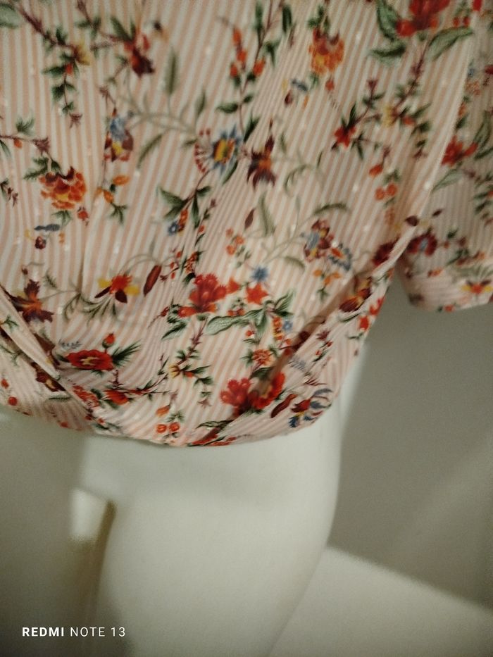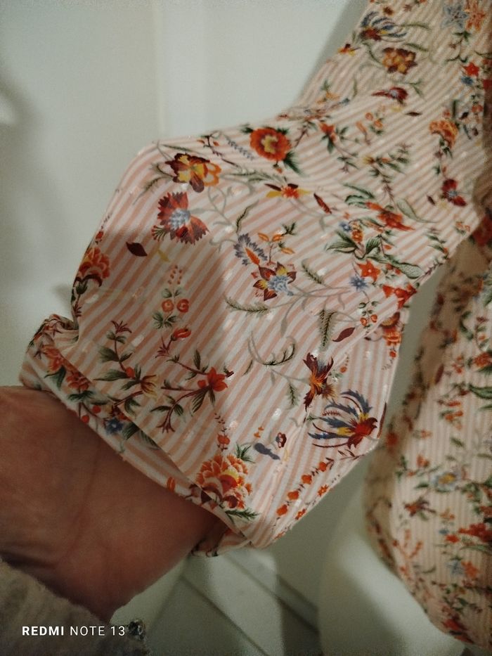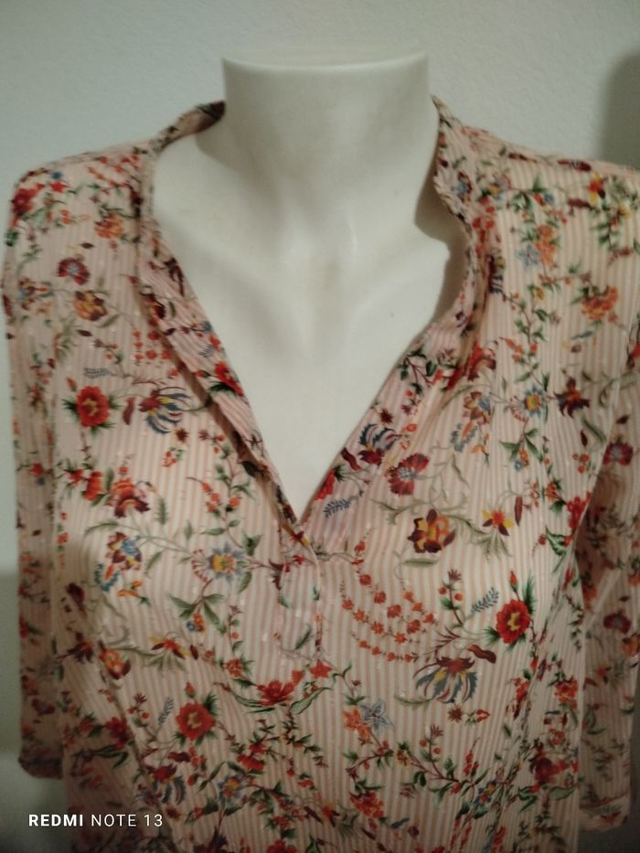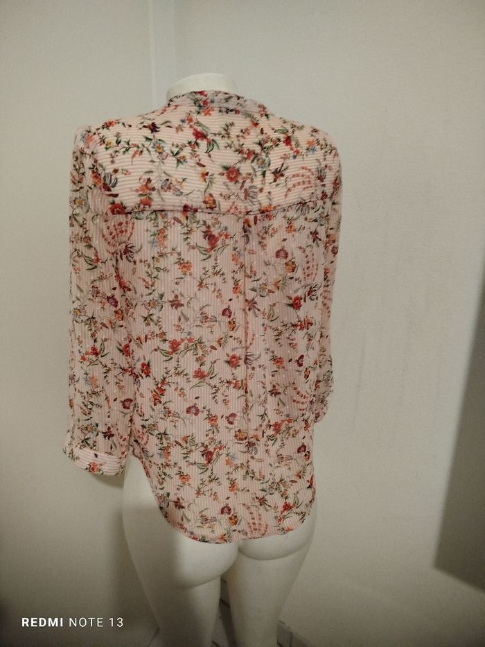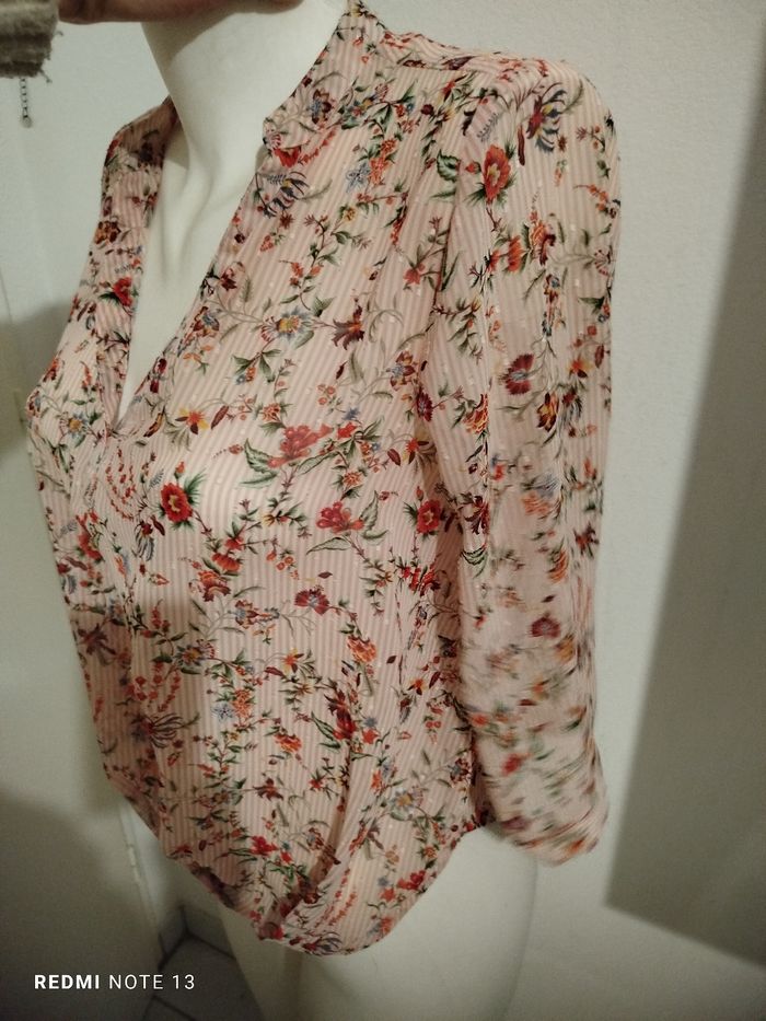 #kytieMfemme. Chemise blouse taille M de marque cache cache en très bonne état comme neuve col v en voile fleurie rose pastel manche au coudes avec bouton taille élastique en voile mesure des épaules 40 cm des aisselles 50 cm hauteur 60 cm drapé plissé sur le bas de la taille ref 78