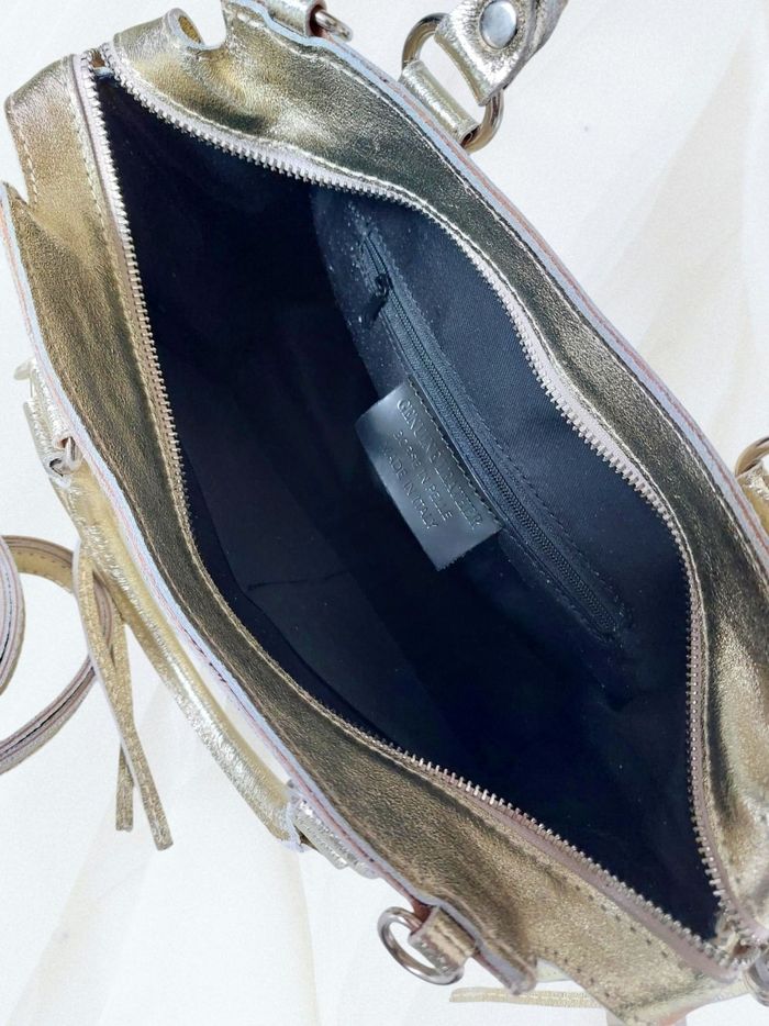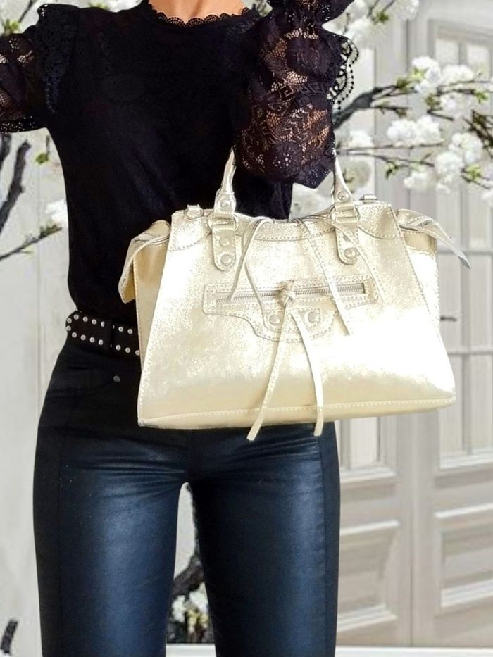 💌 Articles d'origine uniquement 💌 EXPÉDITION rapide 💌 Emballage neuf et soigné Caractéristiques : Bien plus qu'un sac, cette pièce est un véritable petit bijou pour compléter avec style et charme fou une tenue de ville ou de soirée. Pratique, il permet d'avoir à portée de main l'essentiel (téléphone, maquillage, clés, papiers, portefeuille...) A offrir ou pour se faire plaisir 💖🎀🌲 ⚜️ Matière : cuir de vachette métallisé ⚜️ Couleur : or irisé ⚜️ Forme : sac trapèze ⚜️ Finitions/parties métalliques : argentées ⚜️ Taille : moyenne ⚜️ Détails : Bandoulière amovible et ajustable (~ 65 à 118 cm) ⚜️ Porté : bandoulière, crossbody (croisé), épaule, main ⚜️ Ornements : lacets décoratifs ⚜️ Dimensions : L 30 x H 21 x P 13 cm L en base : 33 cm ⚜️ Anses : 13 cm ⚜️ Intérieur : 1 poche zippée et 2 poches plaquées ⚜️ Extérieur : 1 poche frontale zippée ⚜️ Fermeture : zip avec les double curseurs ⚜️ État : neuf