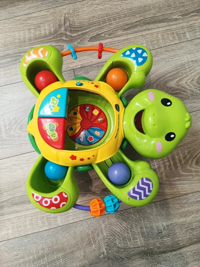 Tortue Tourni Pop'Balles - 9 - 36 mois_ L'enfant place des balles dans le ventre de la tortue qui les compte. Elle se met à danser en tournant sur elle-même avant de les expulser par ses pattes. Bébé s'amuse à les ramasser et les relancer dans le ventre de la tortue. 2 modes de jeu : Apprentissages et Musique.