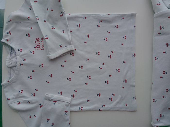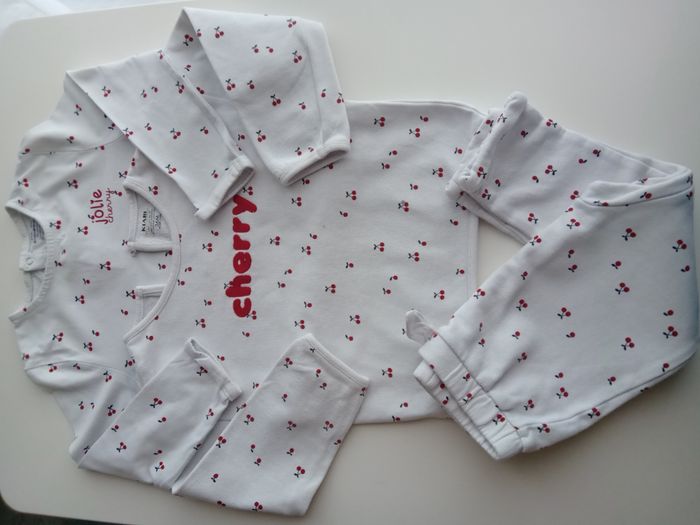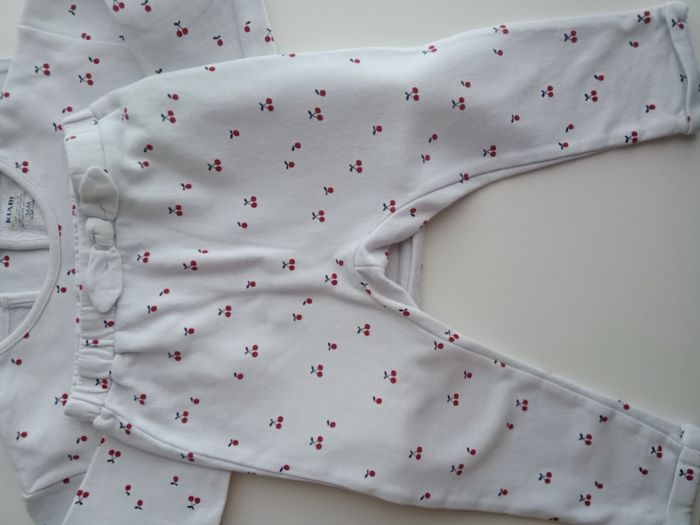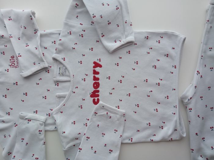 Magnifique🍒🥰 ensemble 3 pièces sur le thème des cerises : t-shirt à manches longues avec des boutons de pression au dos, sweat molletonné avec un bouton de fermeture au dos, pantalon molletonné assorti coupe sarouel. Tout est en très bon état. L'ensemble est magnifique😍 . Si vous aimez le thème cerises, vous trouverez dans mon dressing, une jolie robe à col claudine avec des cerises, un pantalon jean et le gilet assorti avec des cerises, une robe salopette avec des cerises, une veste en jean avec des cerises. N'hésitez pas à visiter mon dressing des réductions sont activées, je fais des envois tous les jours ! 🎁☺️