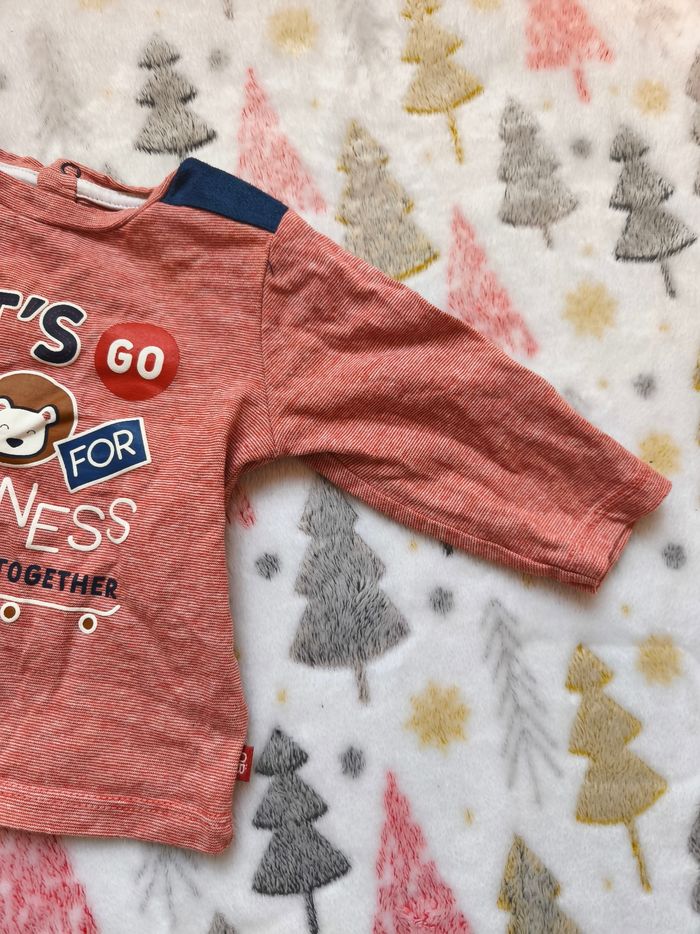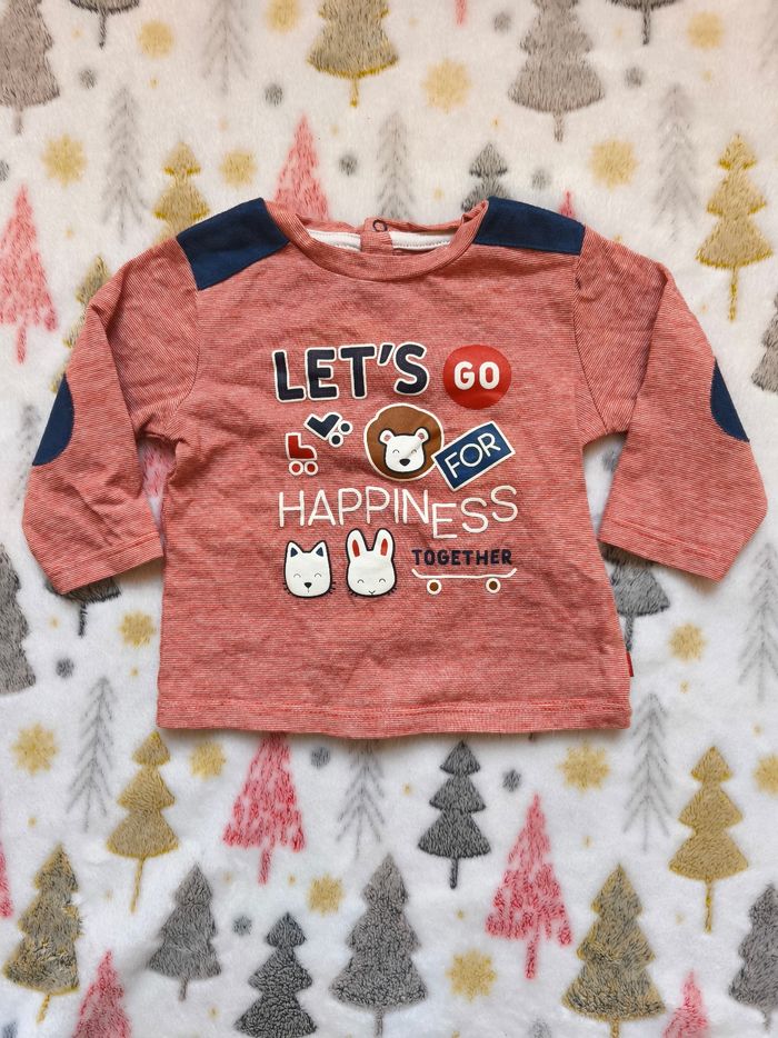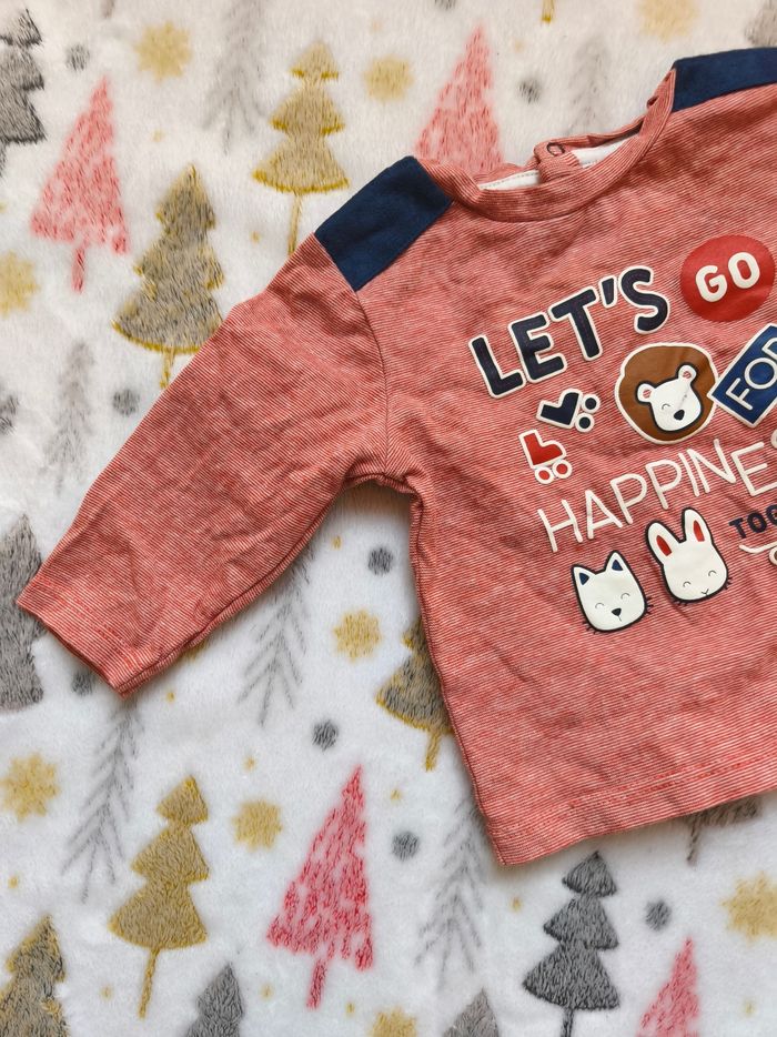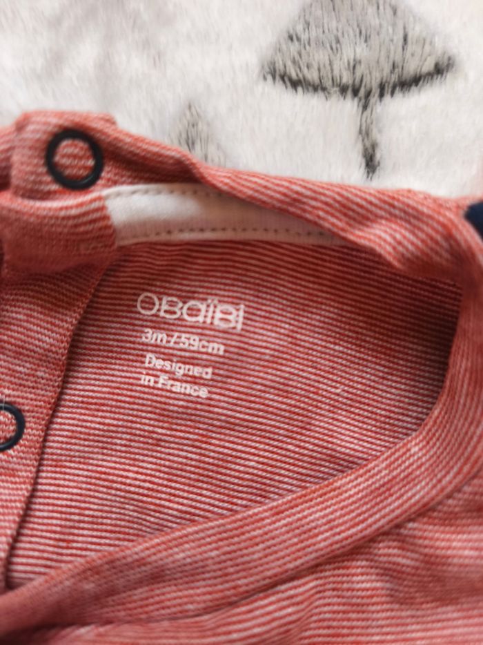Joli t-shirt à manches longues motif chien avec chat et des écritures. Ouverture par l'arrière. Très peu porté. ✅️ Taille 3 mois ✅️ Marque : Obaïbi ✅️ Tres bon état ✅️ Matière : 100% cotton ✅️ Couleurs : Blanc, rouge et bleu