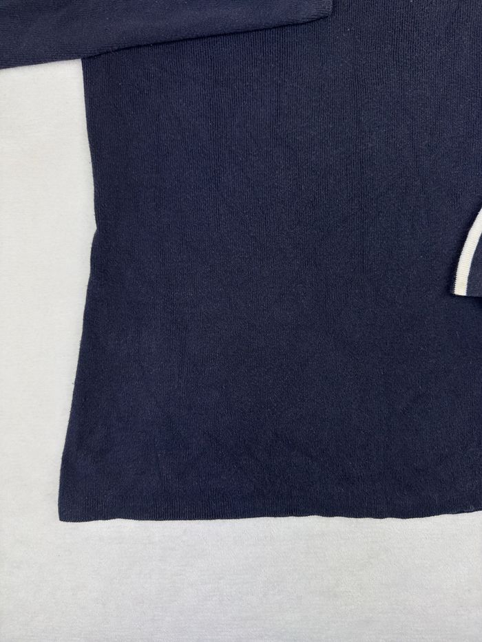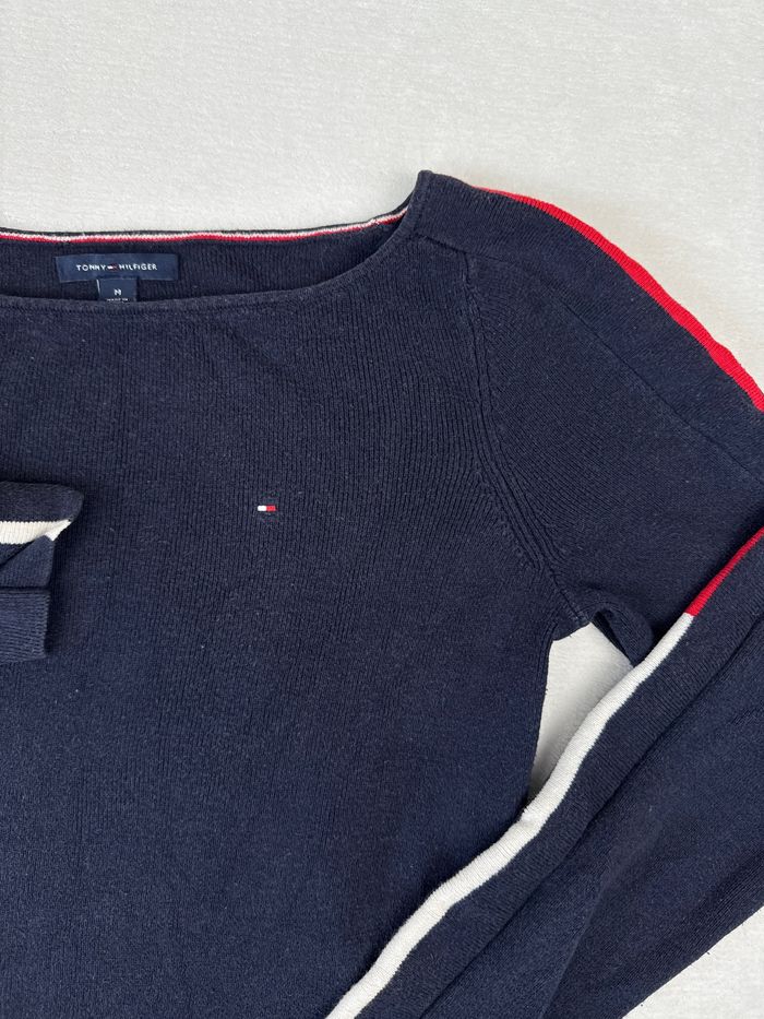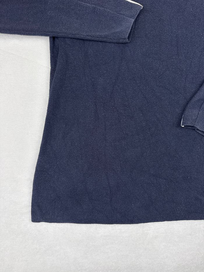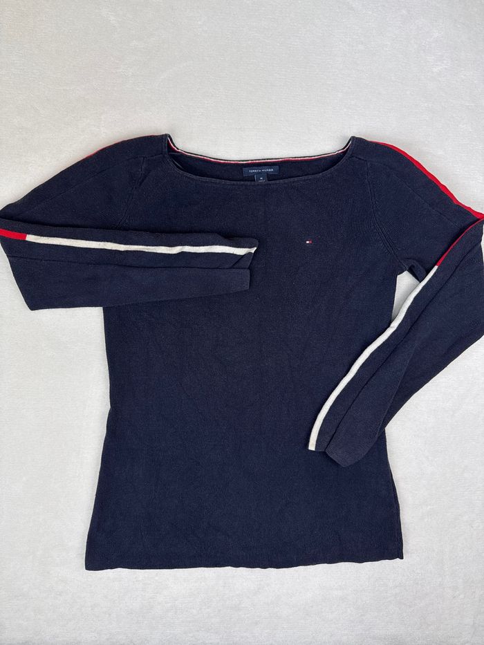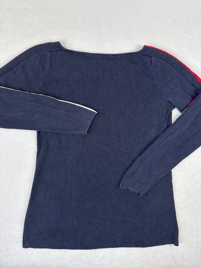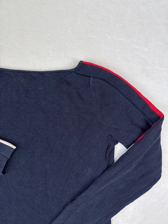 Coupe près du corps, col bateau, manches longues avec bandes tricolores. Logo discret brodé sur la poitrine, look sport-chic. Très bon état général, matière coton stretch agréable à porter. Maille premium, style vintage.