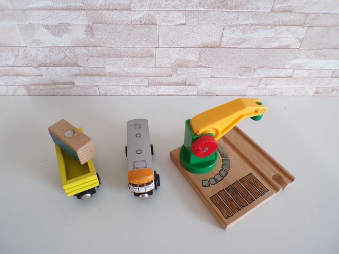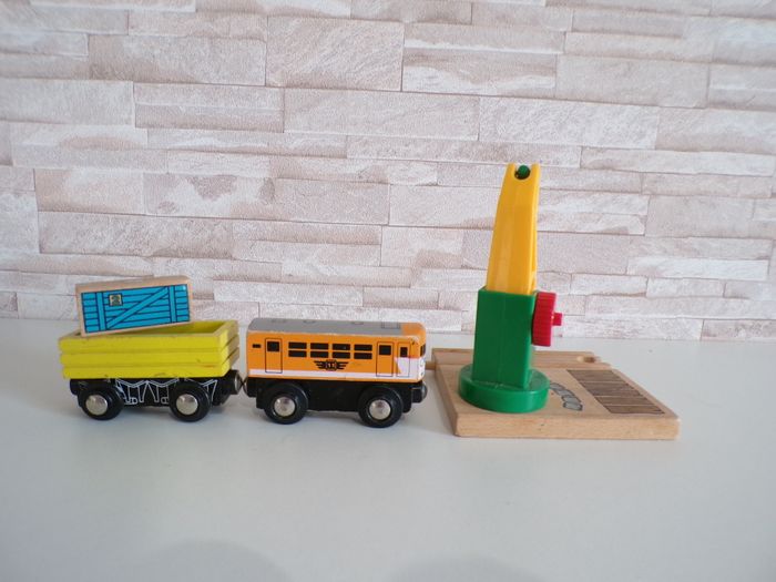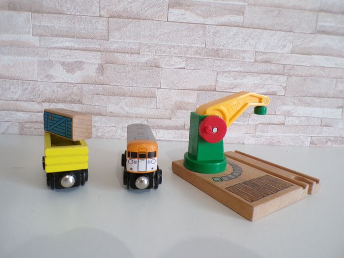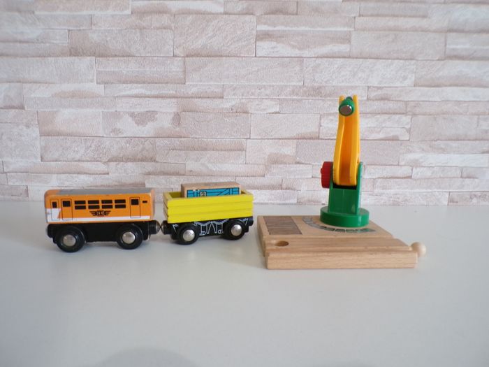 Grue Brio en bon état les rails portent des traces de stylo, elle fonctionne parfaitement, ainsi que son aimant et pivote à 360°. Vendu avec un train et son wagon style brio en bon état avec des traces d'utilisation. Compatible avec les circuits en bois et Brio.