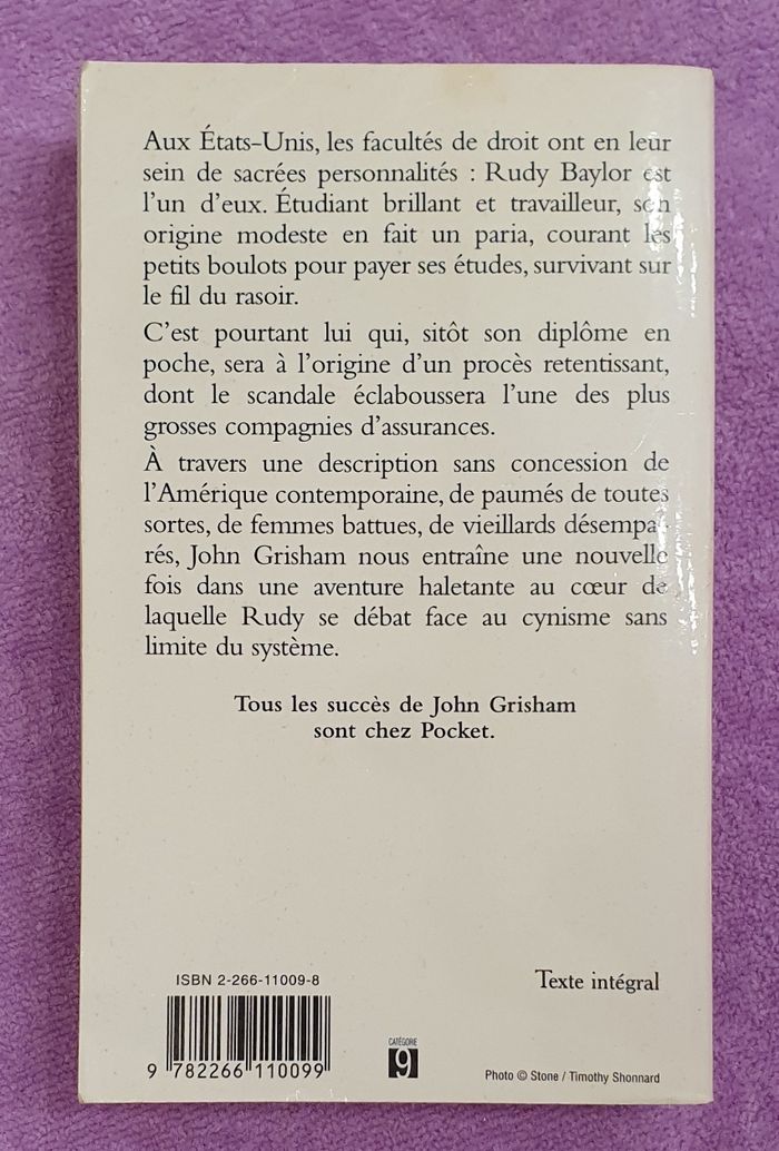 À travers une description sans concession de l'Amérique contemporaine, de paumés de toutes sortes, de femmes battues, de vieillards désemparés, John Grisham nous entraîne une nouvelle fois dans une aventure haletante au coeur de laquelle Rudy se débat face au cynisme sans limite du système..