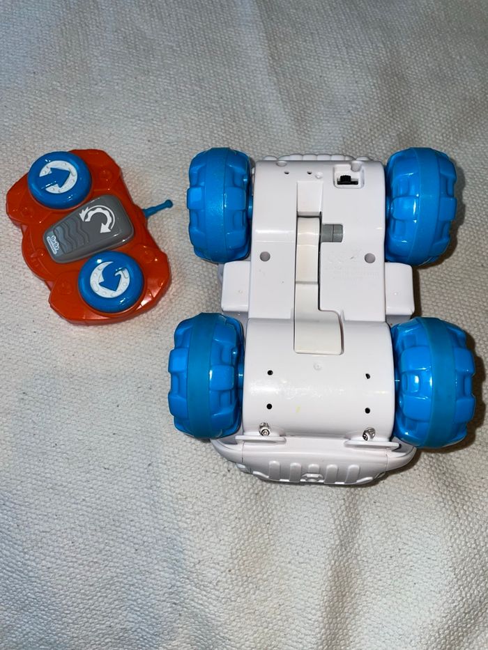 Théo parle et chante et fait des culbutes! Fonctionne avec un mode pilote automatique et un bouton roulade.