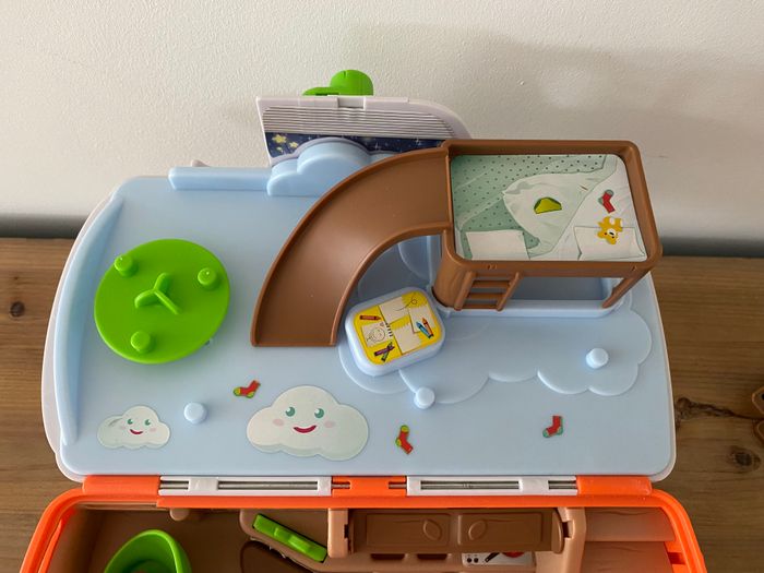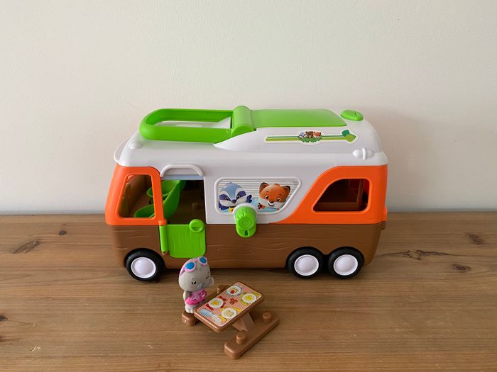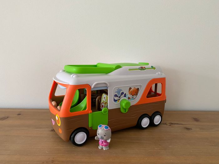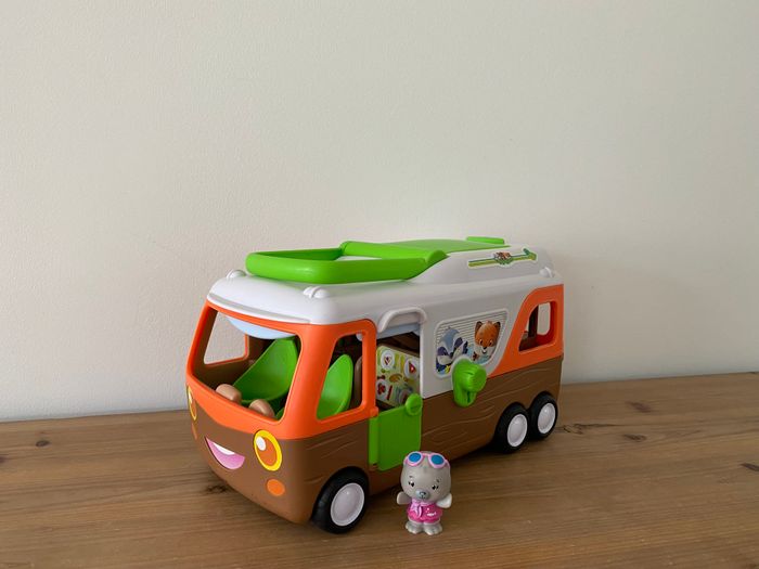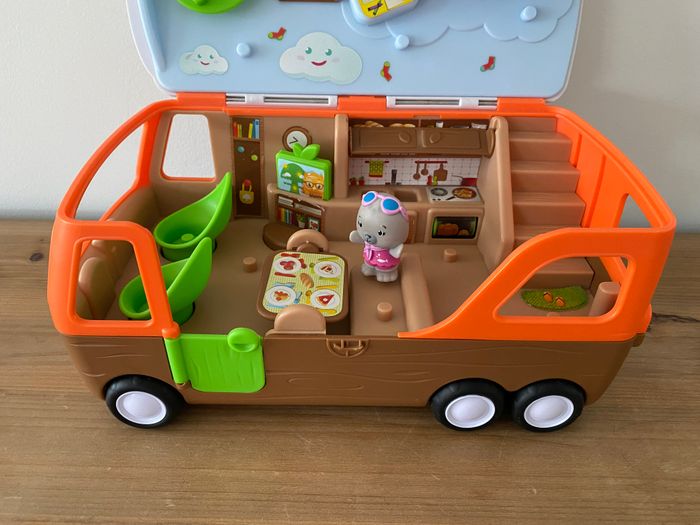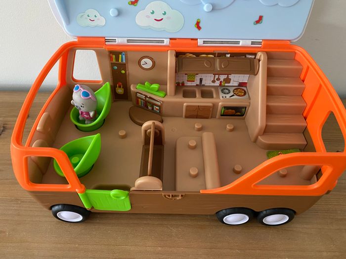 Ce camping-car magique, aux couleurs vives, s'ouvre pour révéler de nombreuses surprises : le poste de pilotage, une cuisine, un espace repas et une chambre salle de jeu.