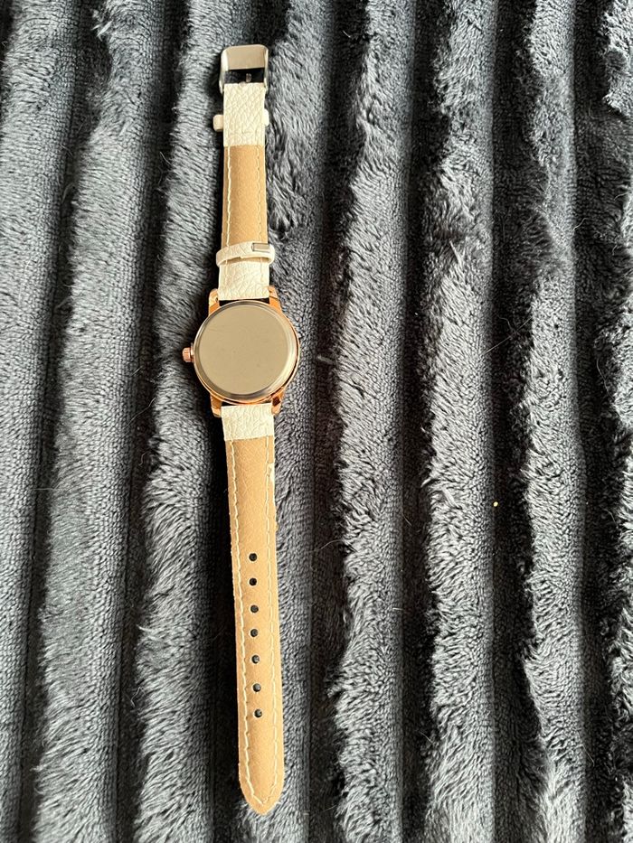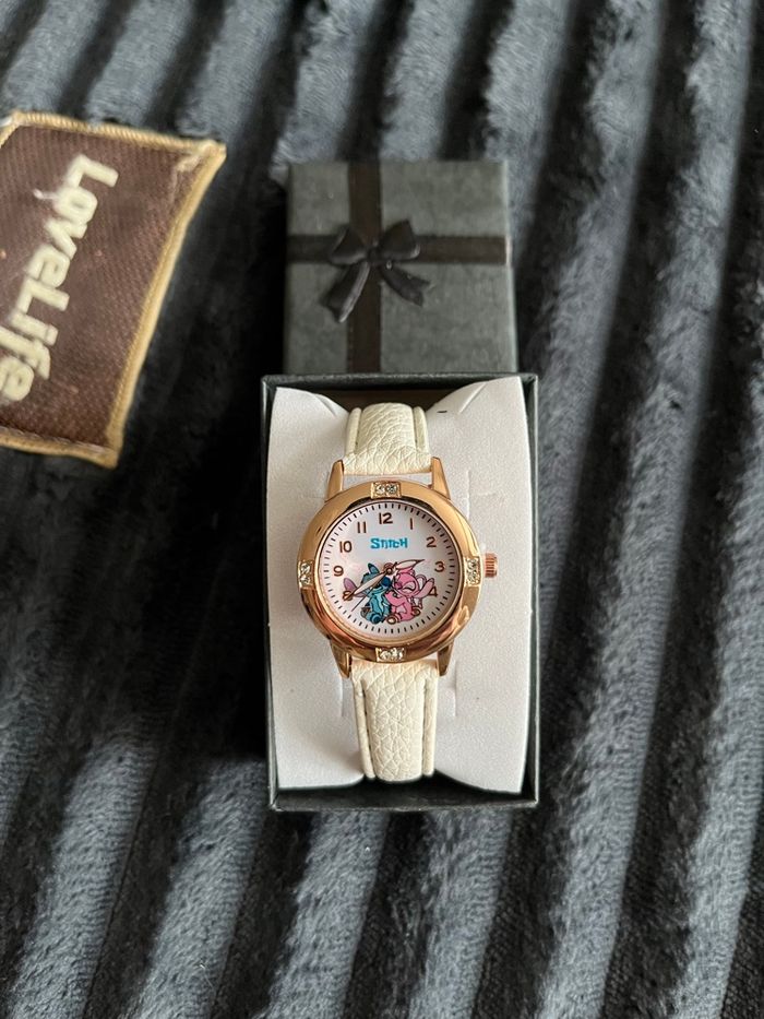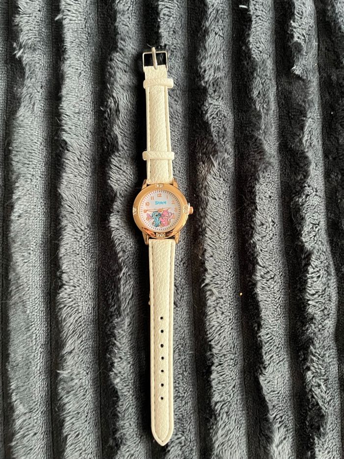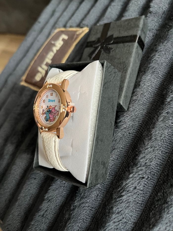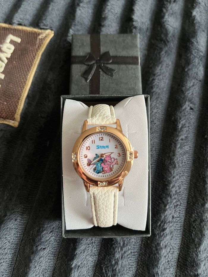 Le cadeau idéal pour Noël 🎅 ou un anniversaire 🎁 Cette montre élégante avec son cadran doré et son motifs stitch dans sa boîte noir Le bracelet est en cuir blanc crème Montre neuf Pile neuve Envoi rapide📦😊