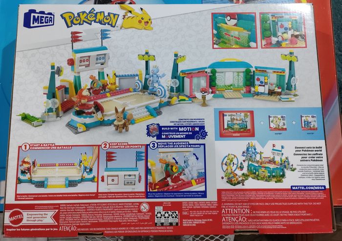 En effet, ce coffret de construction Mega Bloks Pokémon va offrir aux passionnés, enfants comme adultes, une expérience de jeu 2-en-1. Pour pouvoir jouer avec l'arène, les enfants devront donc la construire en assemblant les pièces du coffret. Ils pourront également construire les 5 Pokémon inclus dans le coffret : Pikachu, Machoc, Evoli, Chocodile et Brutalibré.