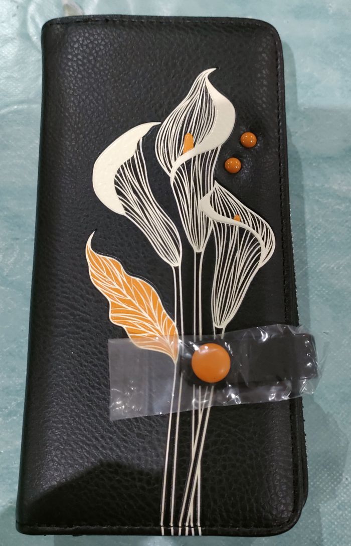 Emportez l'élégant portefeuille pochette orné d'un magnifique appliqué floral noir et blanc. Ce portefeuille pochette est rehaussé d'un passepoil contrastant du plus bel effet. Il est doté d'un compartiment zippé pour plus de sécurité.