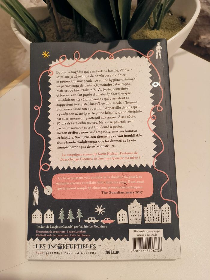 Depuis la tragédie qui a anéanti sa famille, Pétula, seize ans, a développé de nombreuses phobies . et prétend qu'une prudence et une hygiène extrêmes lui permettront de parer à la moindre Catastrophe. Mais est-ce bien réaliste ?... Au lycée, contrainte et forcée, elle fait partie d'un atelier d'art-thérapie. Les adolescents "à problèmes" qui y assistent se supportent tout juste : Jusqu'à ce que Jacob, "l'homme bionique", fasse son apparition. Appareillé depuis qu'il a perdu son avant-bras, le jeune homme, grand cinéphile, est aussi moqueur qu'attentif aux autres. A ses côtés, Pétula se sent enfin revivre. Mais il se pourrait qu'il cache lui aussi un secret trop lourd à porter...