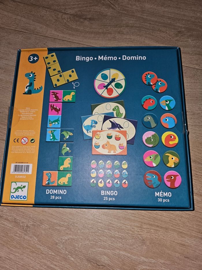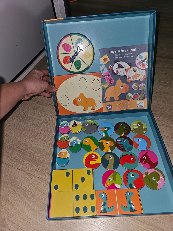 Bonjour je vends ce jeu 3en 1 complet avec regle du jeu en très bon état La mallette de jeux Bingo Mémo Domino Dinosaures propose 3 jeux indémodables pour votre enfant: domoino, bingo et mémo