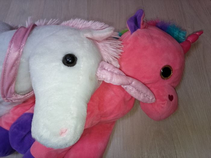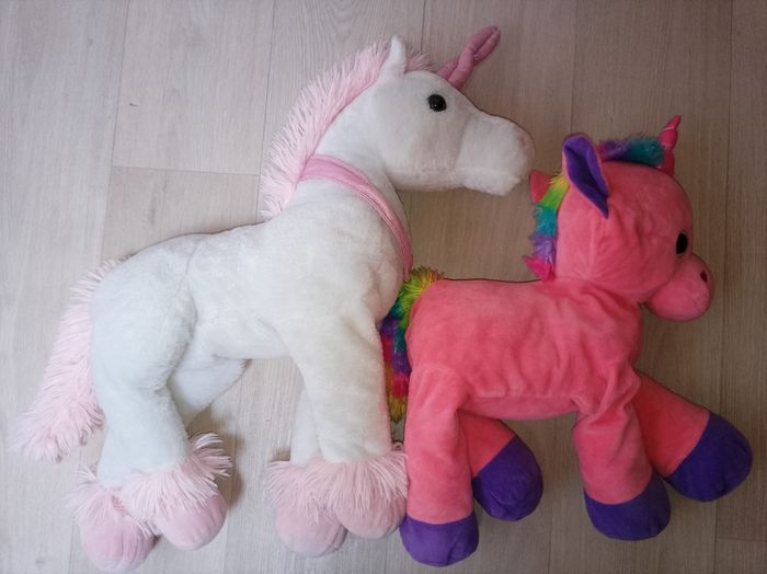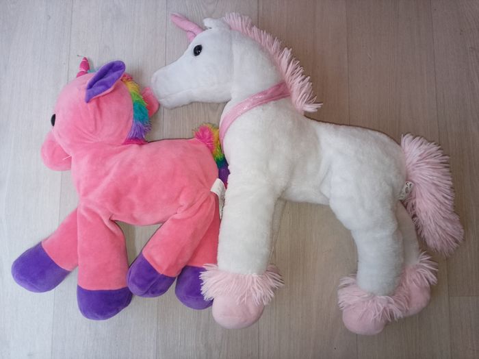 - Peluche licorne blanche et rose clair avec collier en tissu. Mesure dans les 40 cm de la tête aux pattes.