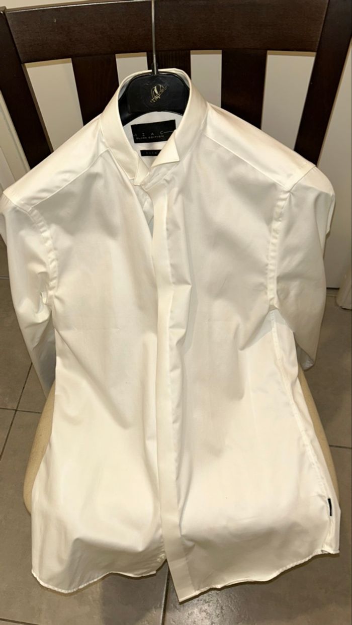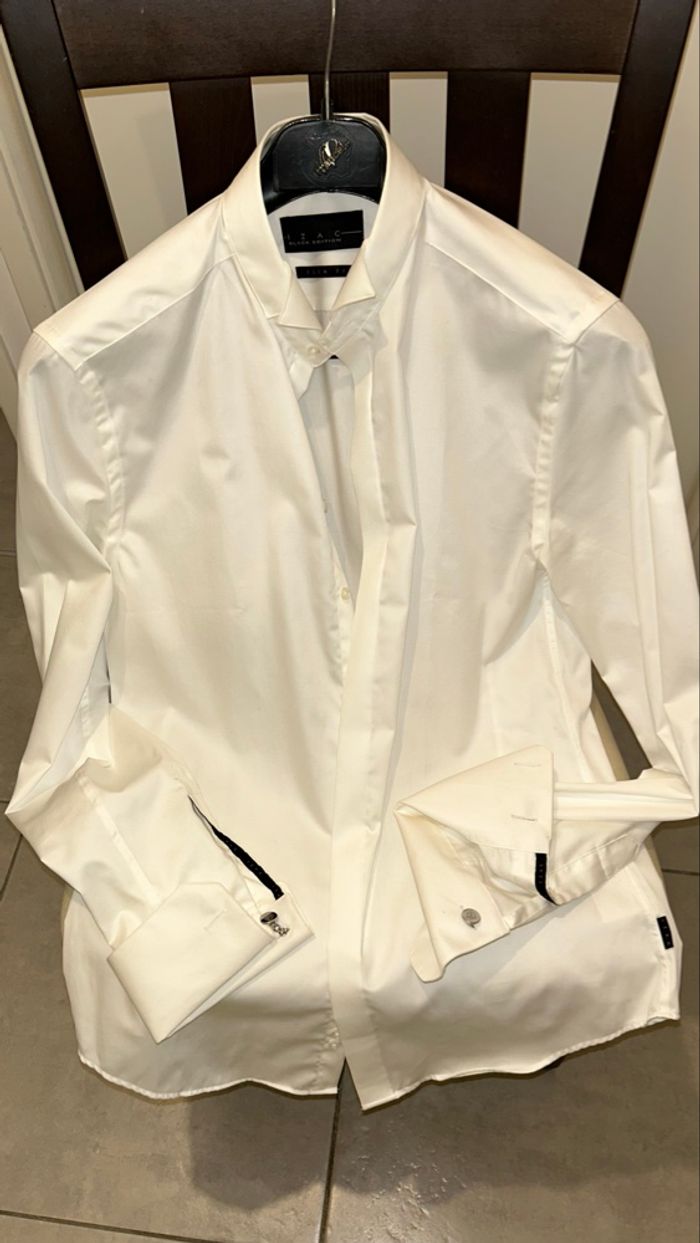 -Chemise blanche IZAC à noeud papillon avec boutons de manchettes, taille 38/taille 2 -Pantalon de costume bleu/gris IZAC, taille 38 -Veste de costume bleu/gris IZAC, taille M -Cummerbund bleu en soie, taille M (ceinture de smoking de marque Italienne BOGGi) -Noeud papillon bleu IZAC -Housse de costume IZAC -État neuf avec étiquette et prix d’achat -État irréprochable, il n’a jamais été utilisé -Remis en main propre -Prix 250€