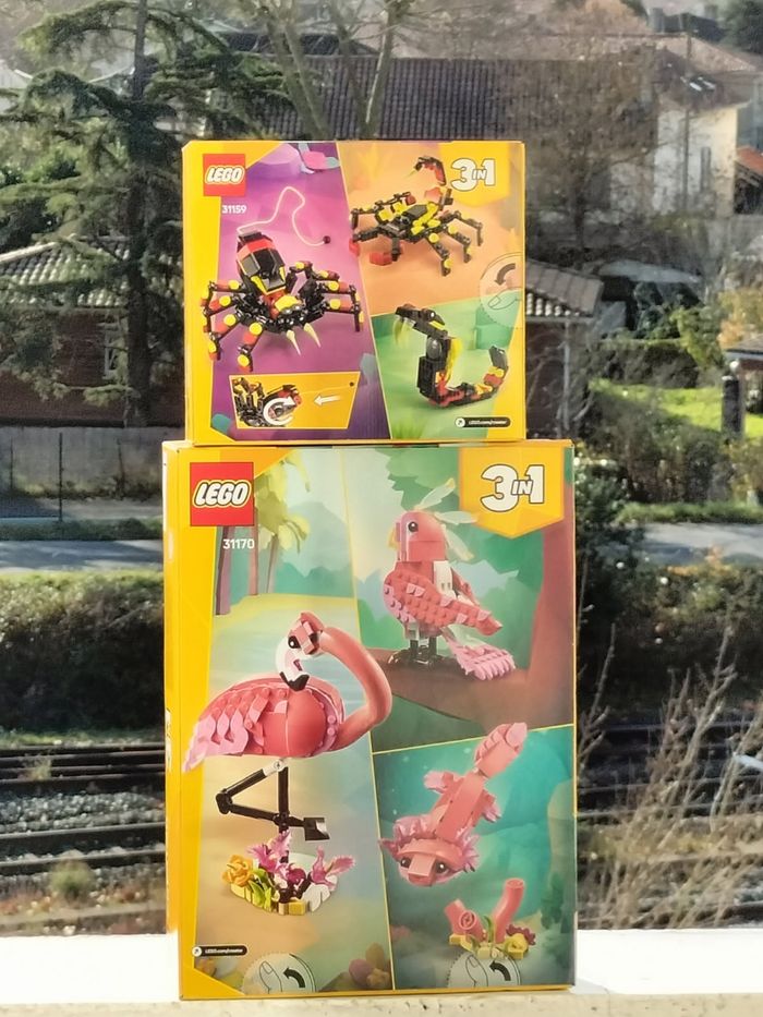 Ce Set permet de construire 3 animaux sauvages avec les mêmes briques Lego. 1 Cacatoès rose, 1 Axolotl rose et 1 Flamant rose.