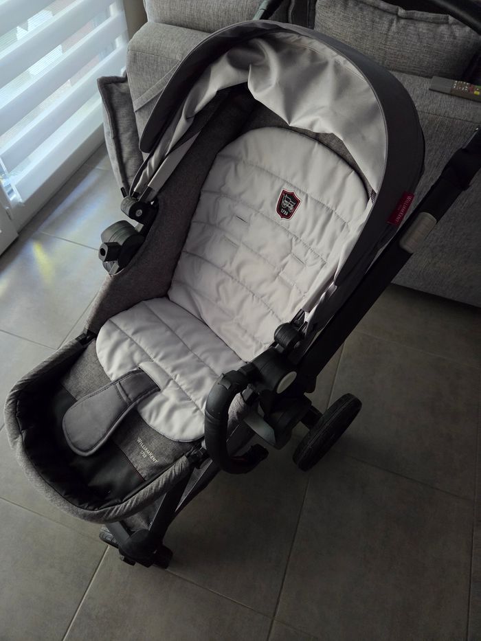 À vendre poussette duo William Kent comprenant châssis, Maxi-Cosi avec base isofix pour la voiture, adaptateur pour fixer le Maxi-Cosi sur le châssis (acheté séparément), grande assise, habillage de pluie pour le Maxi-Cosi (acheté séparément).