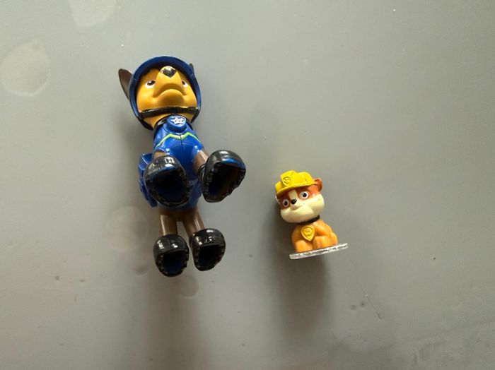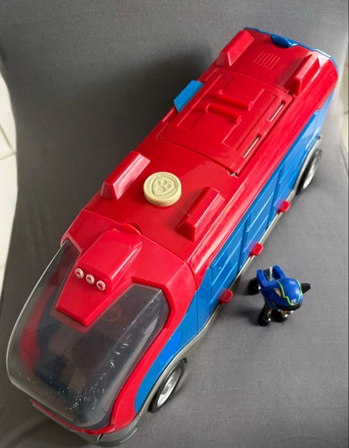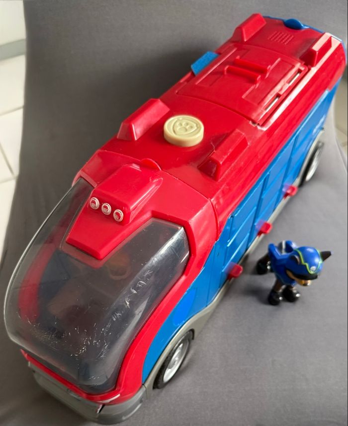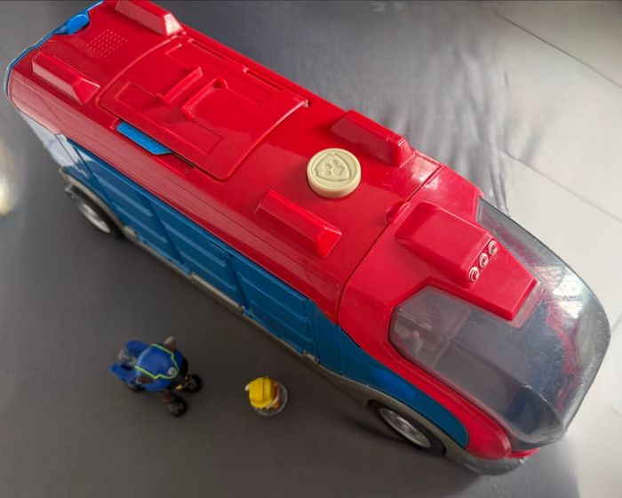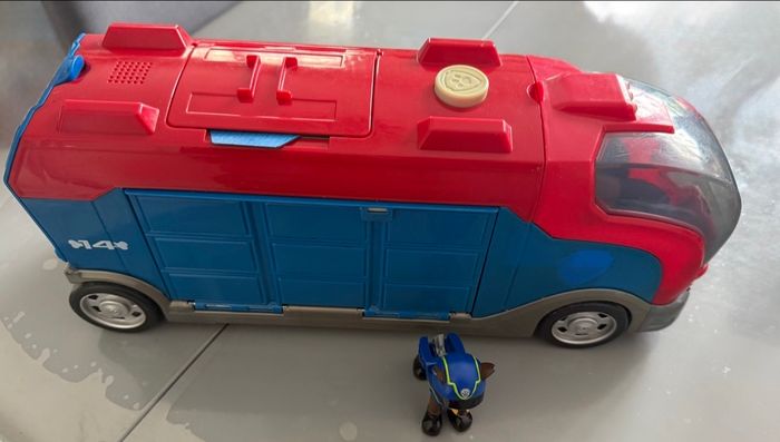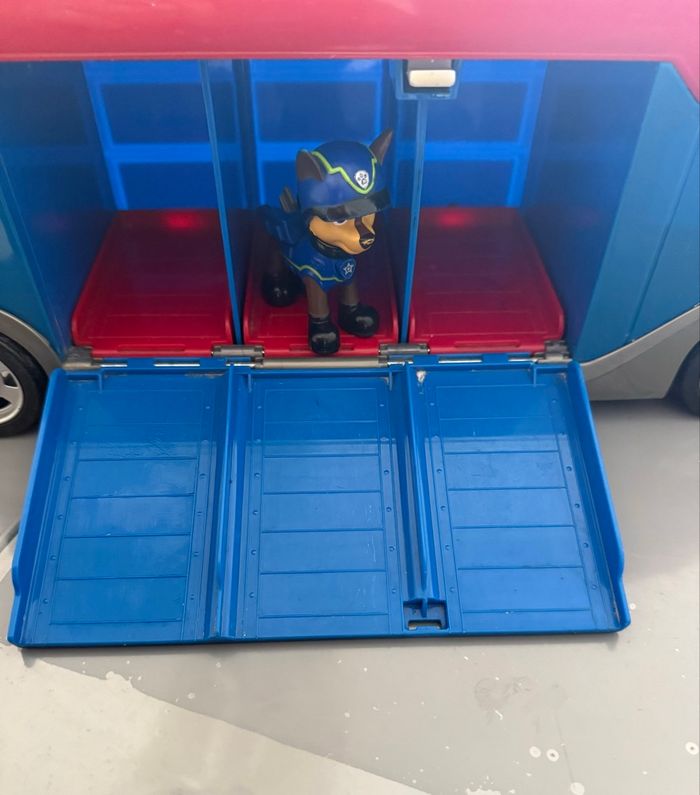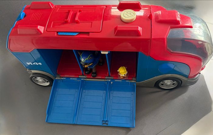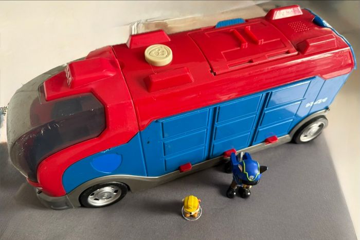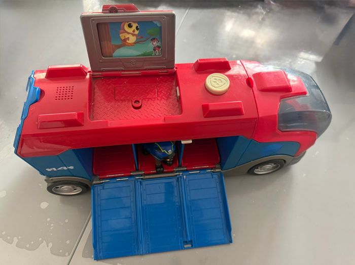 - 1 camion bus bleu et rouge célèbre de la Pat' Patrouille avec un bouton blanc au dessus qui permet d'ouvrir la grande porte pour faire sortir rapidement des véhicules (non inclus)