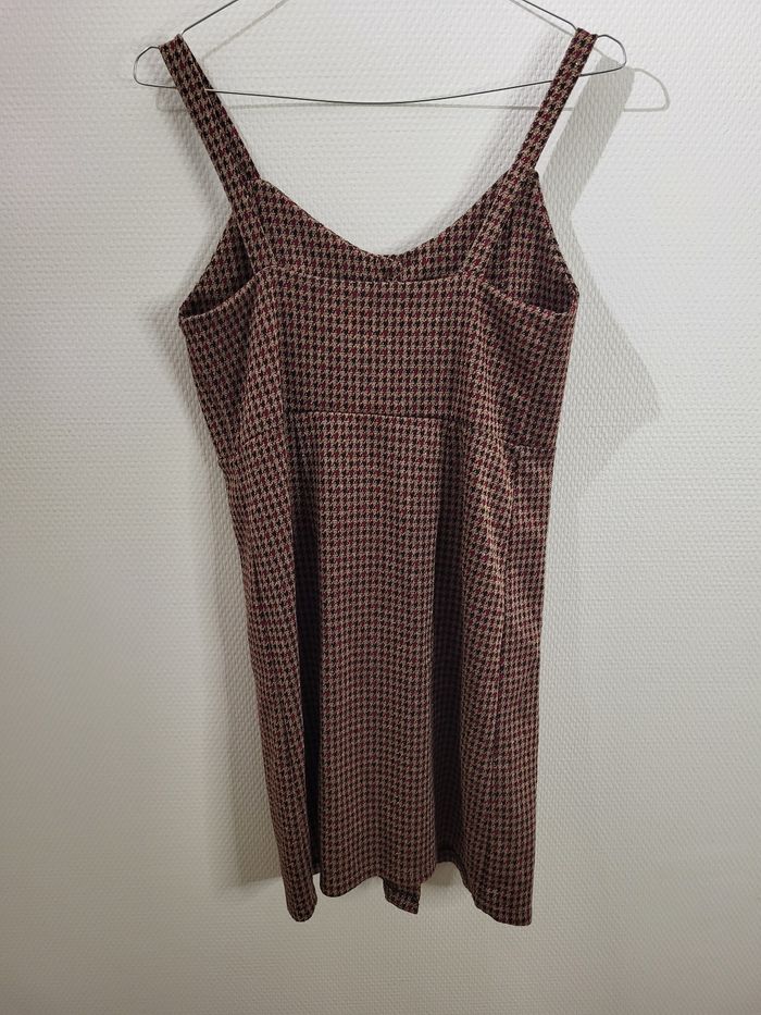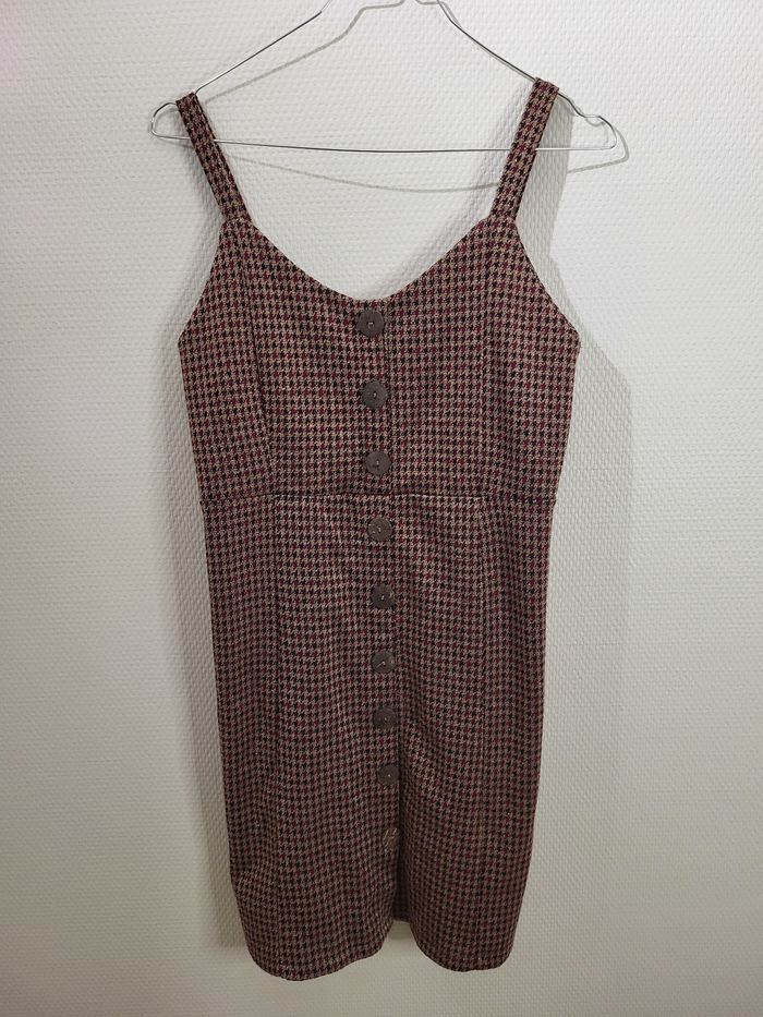 Motif pied-de-poule dans des tons marron/bordeaux, avec boutonnage sur toute la longueur à l’avant. Coupe élégante, esprit vintage revisité.