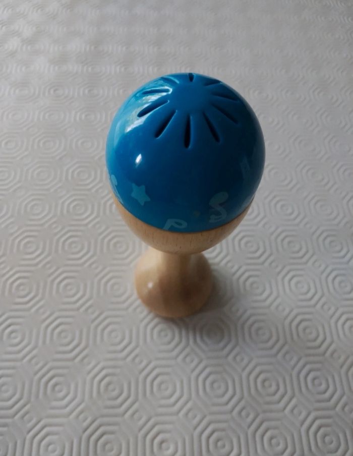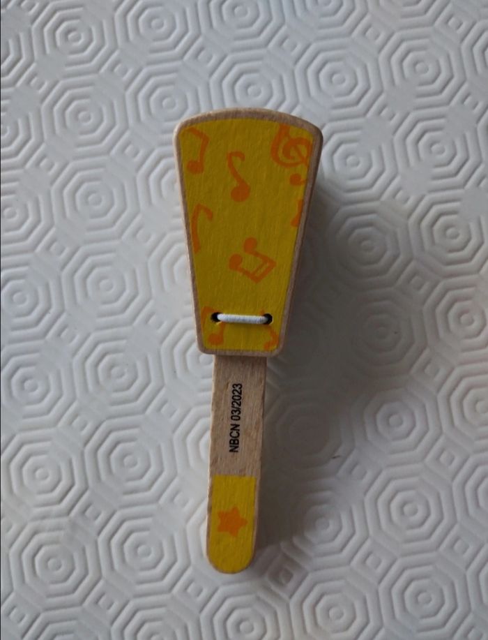 Lot de trois jouets en bois instruments de musique pour éveil musical, composé d'un tambourin rouge, d'une maracas bleue et d'une claquette jaune. Parfait état si ce n'est le tambour qui a une fissure sur chaque côté (soit deux) cf photos, ce qui ne gêne en rien son fonctionnement. Sans BPA, peintures non toxiques.