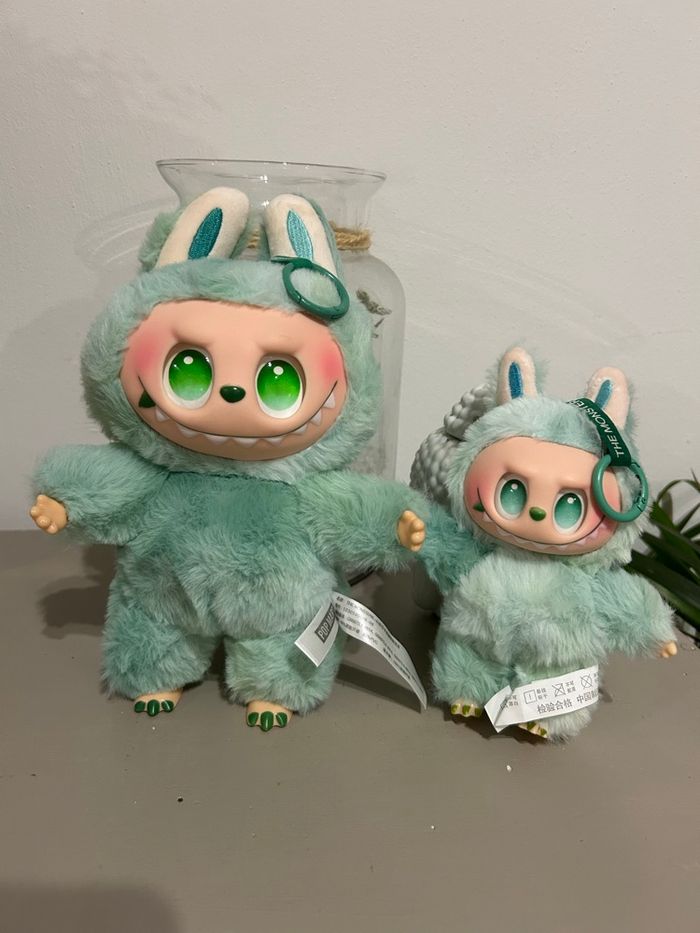 Grand Labubu vert de 25cm Pas d’emballage pour ce format ⚠️Le petit Labubu à coter n’est pas inclus dans le prix il est là juste pour montrer la différence de taille⚠️