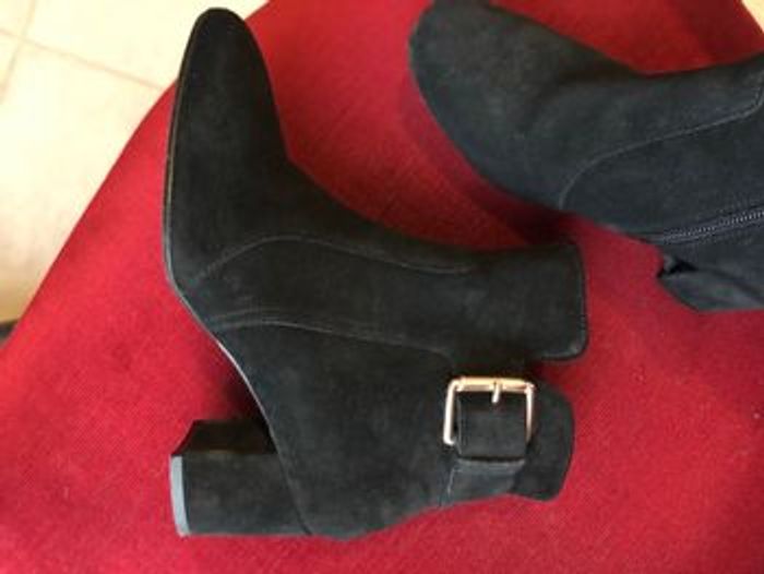 Vends bottines cuir noir imitation daim fantaisie boucle dorée sur le côté talon carré 5,5 cms bon état ( un talon un peu abîmé à l’intérieur voir photo) pointure 36 marque Bocage