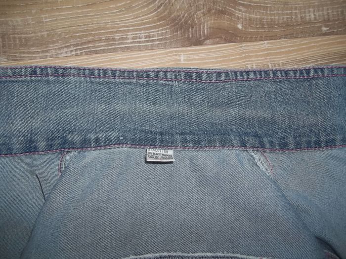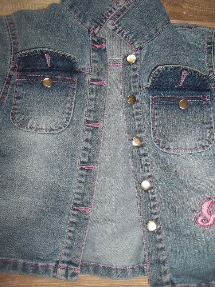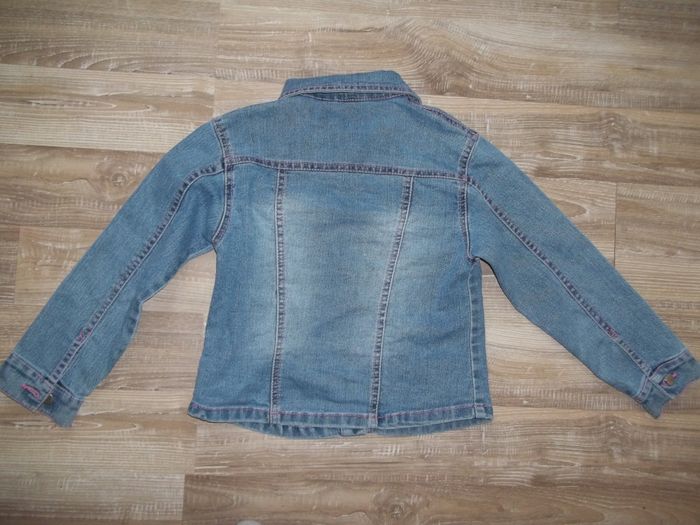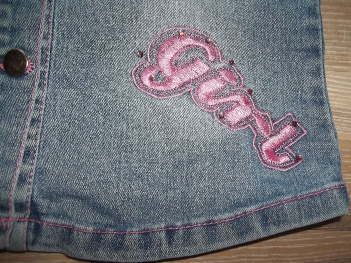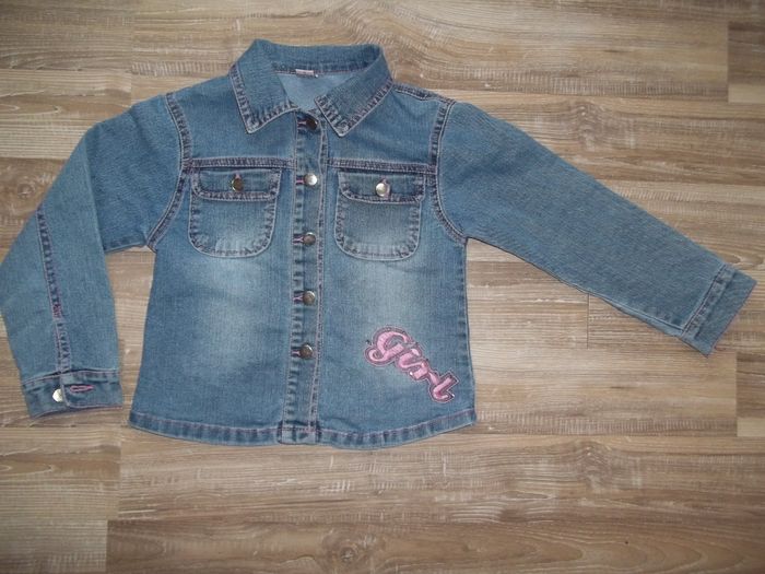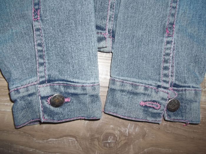 Veste en jean souple (97 % coton 3 % élasthanne) stone délavé avec coutures rose clair et broderie rose "Girl" sur bas avant gauche. Fermée par 5 boutons, 2 petites poches fermées sur poitrine, bas légèrement arrondi. Longueur 41 cm, manches 41 cm, largeur épaules 32 cm, aisselles 35 cm, poignets 9/10 cm.