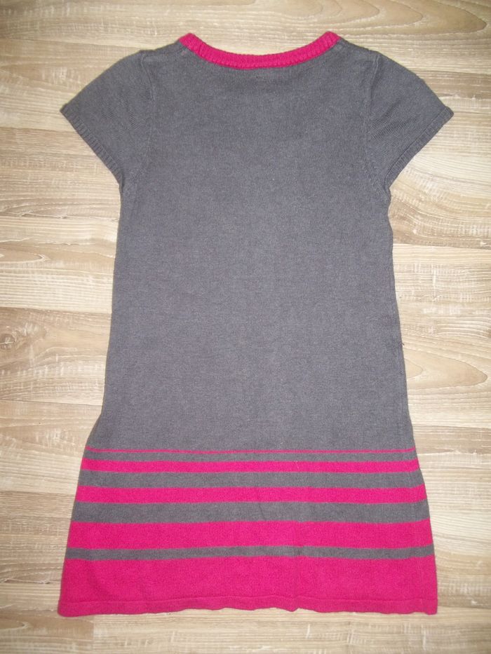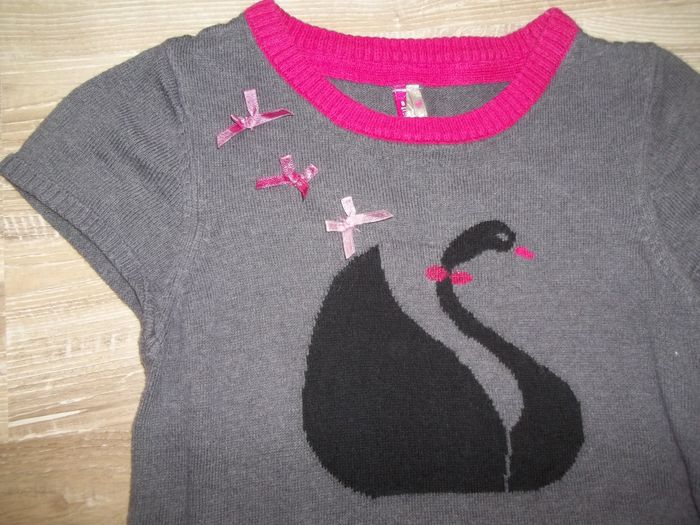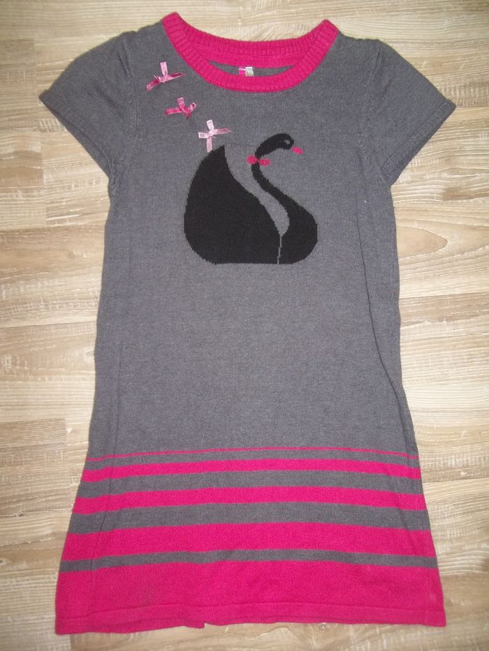 Robe en maille fine gris, rayures bas et col rose fuchsia, cygne noir et quelques petits rubans roses, col rond et mancherons. Plus l'étiquette de composition mais je pense un mélange de coton et acrylique (plutôt doux). Longueur 61 cm, largeur aisselles 31 cm.