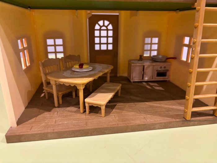 Accessoires : lit avec couette, cuisinière avec poêle, la table avec ses deux chaises et son banc, l’assiette et son omelette