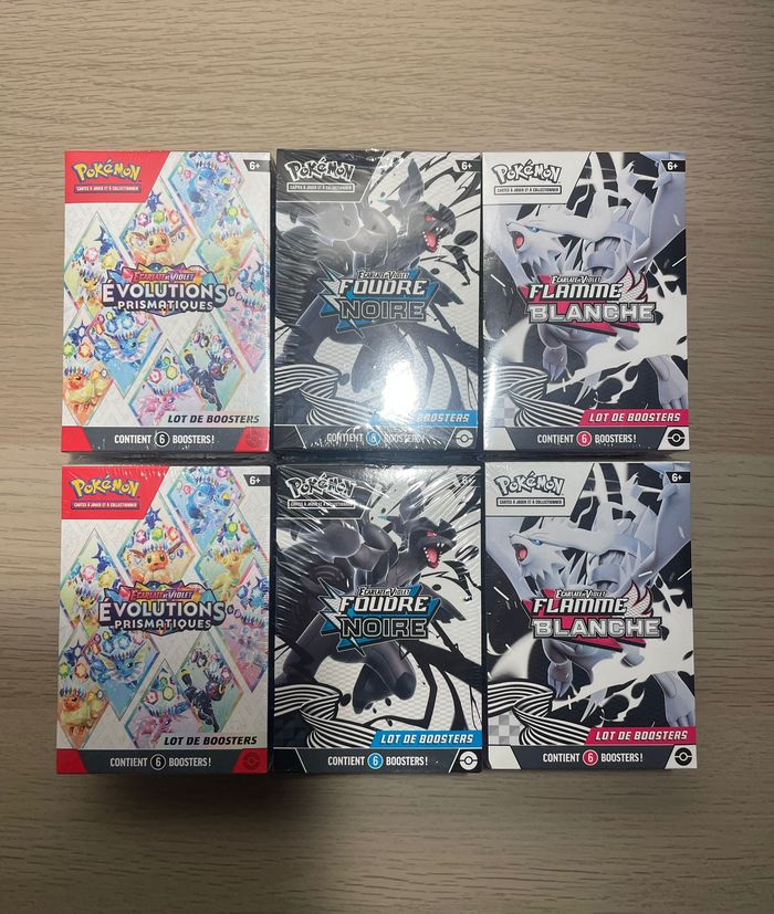 • 🔥 Pokemon - Lot de Bundles EV10.5 et EV8.5 (FR). 2 Bundles Foudre Noire, 2 bundles Flamme blanche et 2 bundles Evolutions Prismatiques