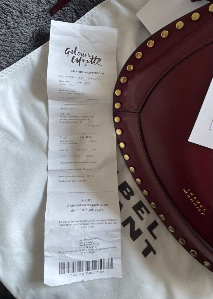 Achat: aux Galeries Lafayette, ticket de caisse fourni