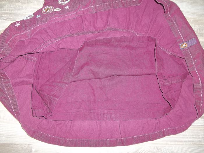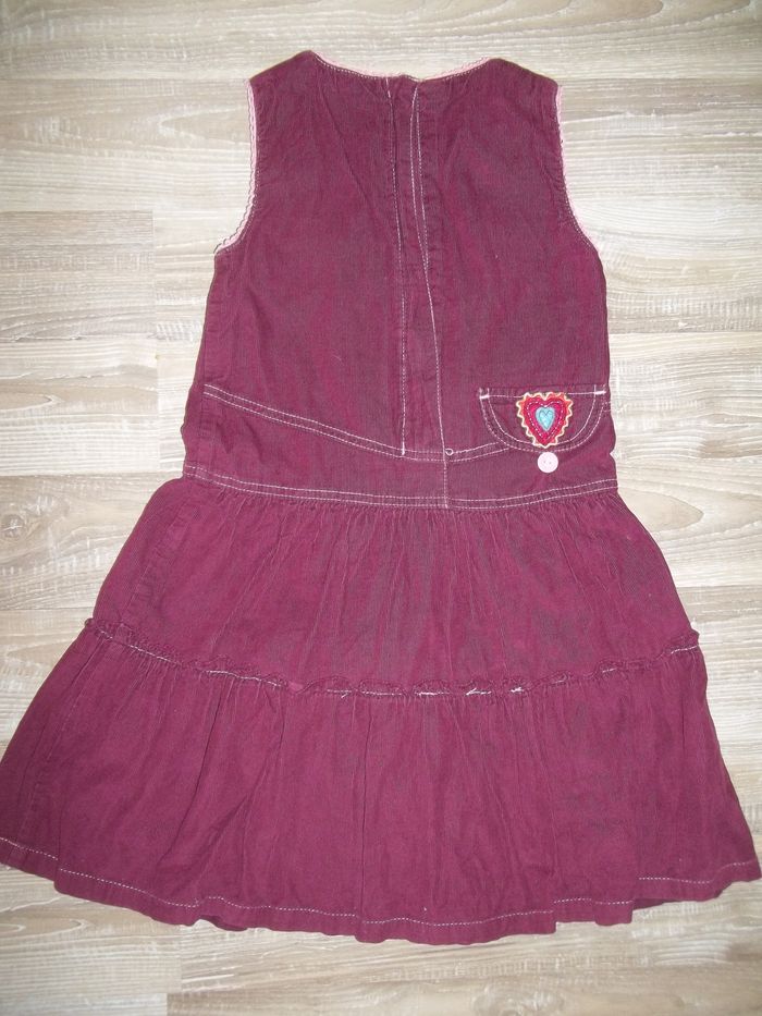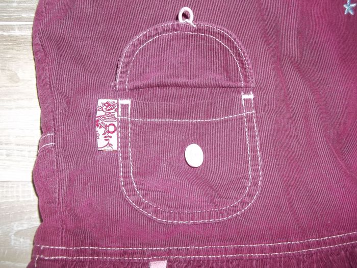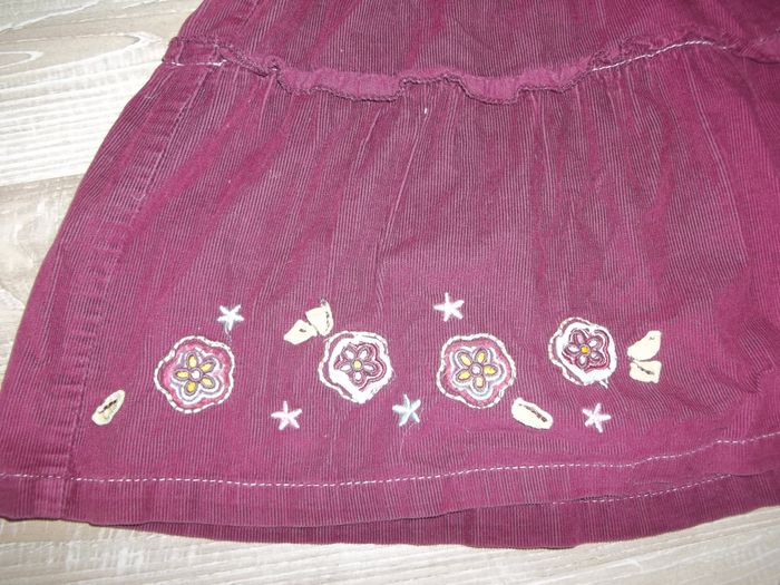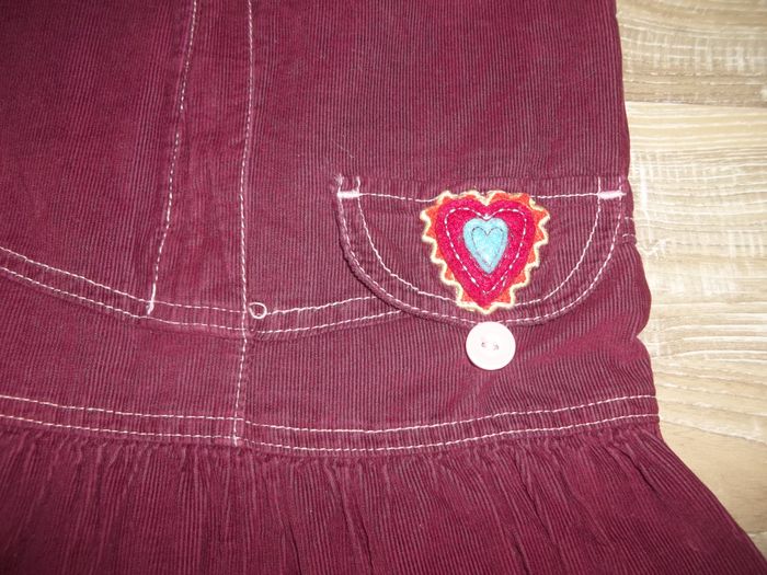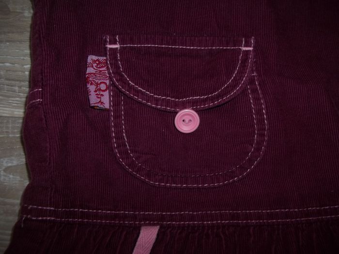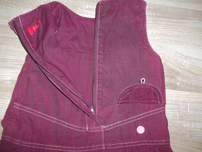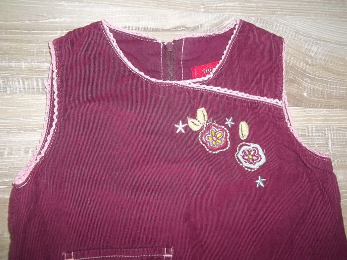 Robe sans manche, col rond, bas ample, en velours finement côtelé et doublée, 100 % coton. Fermeture par zip dos (27 cm). Coutures apparentes, biais dentelé ouvertures manches et col (effet faux cache-coeur) et petit ruban rose clair, patchwork petites fleurs sur poitrine et bas droit, petite poche fermée par bouton devant (et fausse derrière). Longueur 65 cm, largeur aisselles 30 cm.