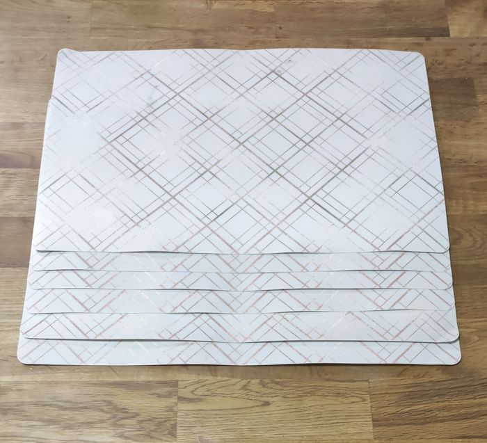 Lot de 6 Sets de table élégants, au design moderne . Parfait pour un usage quotidien ou pour des occasions spéciales. Facile à nettoyer avec un chiffon h umide . Quelques traces d'usures tâche minime.