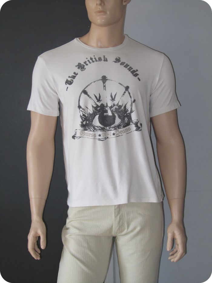 Bonjour, je vends un tee-shirt. Couleur blanc / gris. - 1 petit trou reprisé au centre Marque : Guess (95% Coton / 5% Elasthanne) Taille : 48 (XL) Bon état ! Prix : 4€