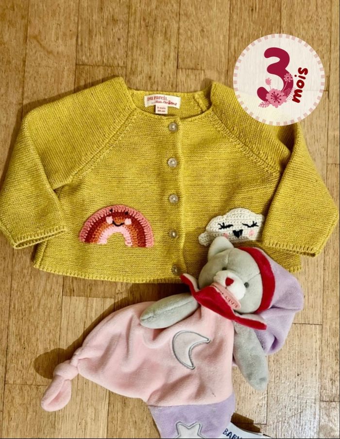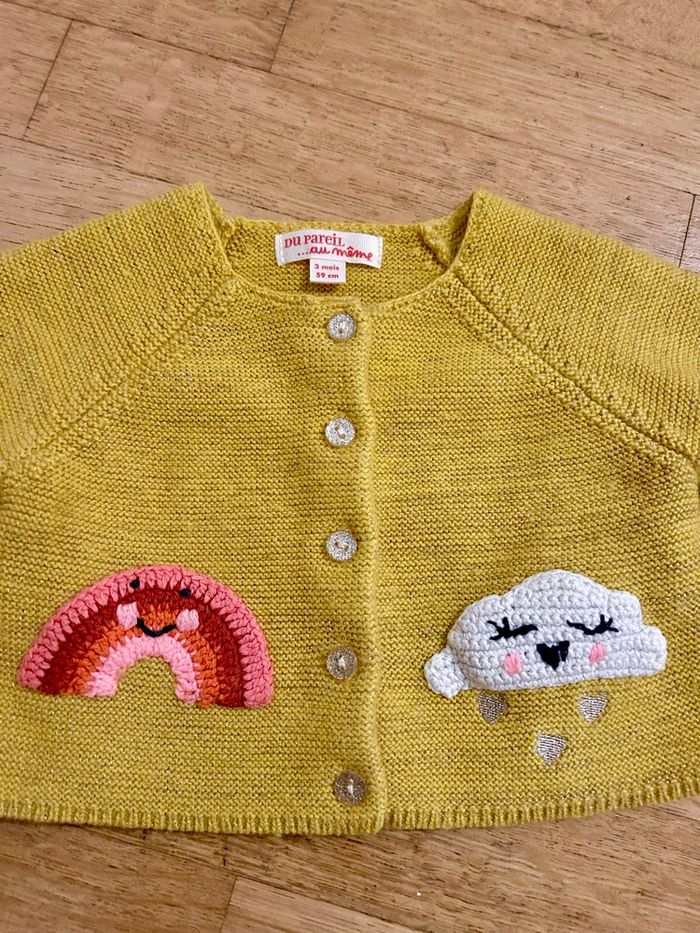 #dpam #dupareilaumeme #giletbebe #gilet3mois #jaunemoutarde #bebefille #bebegarcon #mixte #arcenciel #nuage #maillebebe #vetementbebe3mois