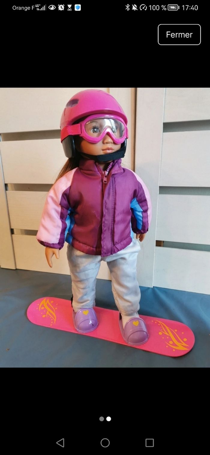 Comprend une combi de ski, un surf, un casque des chaussures et des lunettes de ski.