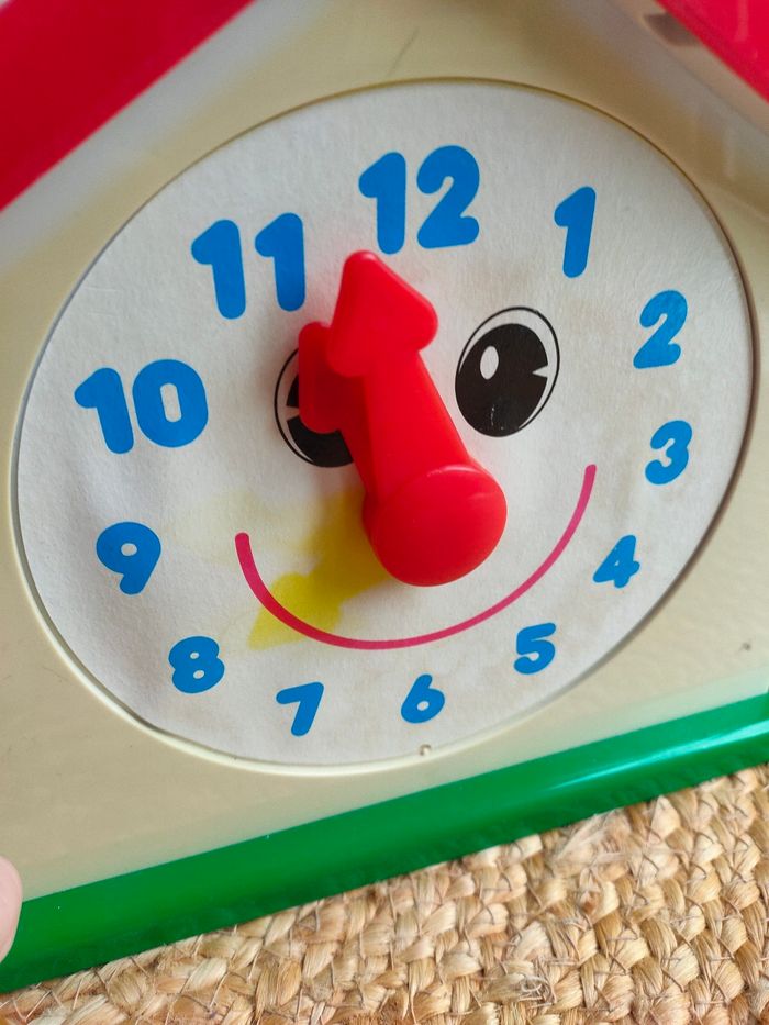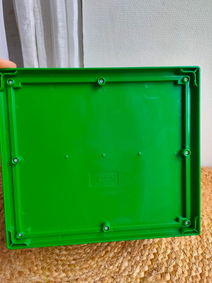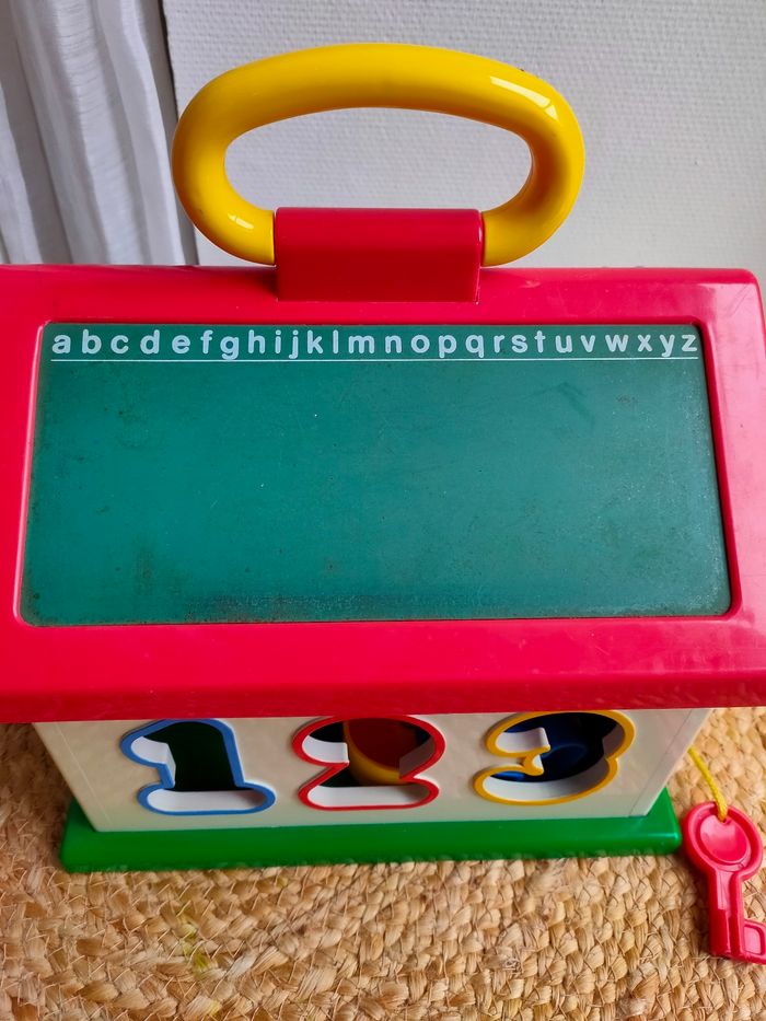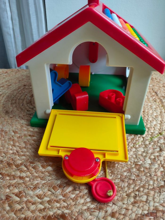 Grosse poignée sur le dessus de la maison pour faciliter le transport. Elle est en plastique et Complet. Il a été pas mal manipuler, le toit avec l'ardoise, le miroir et l'horloge ont des traces, les parties blanches ont légèrement jaunit. Hormis cela le jeu est en bon état.