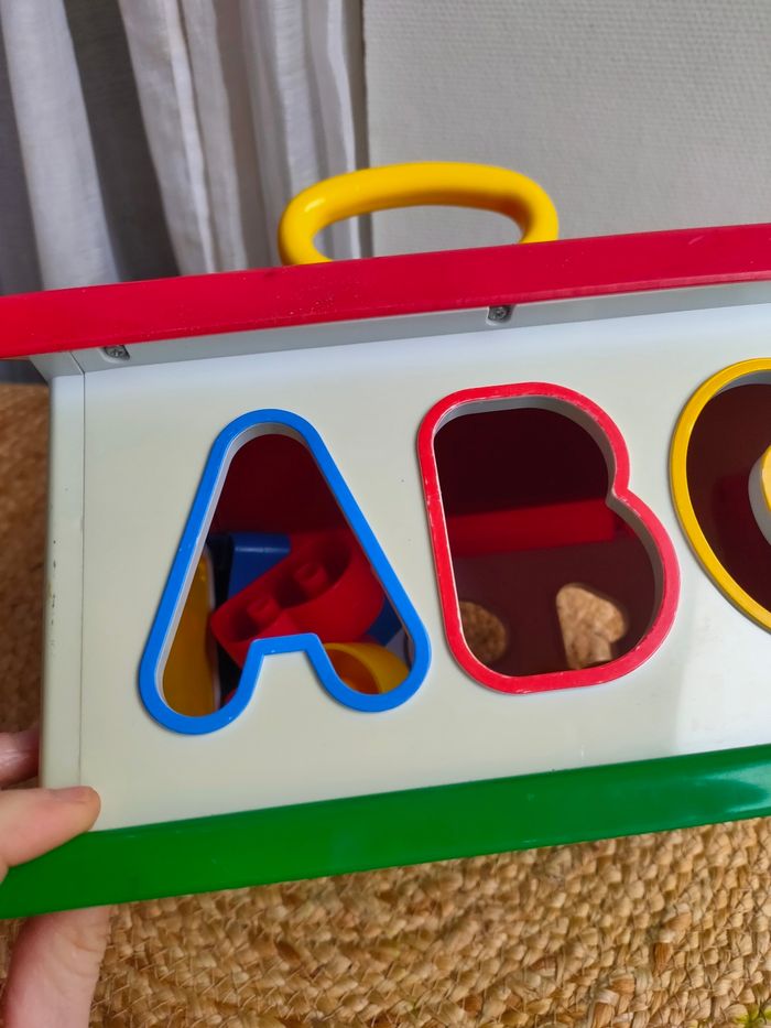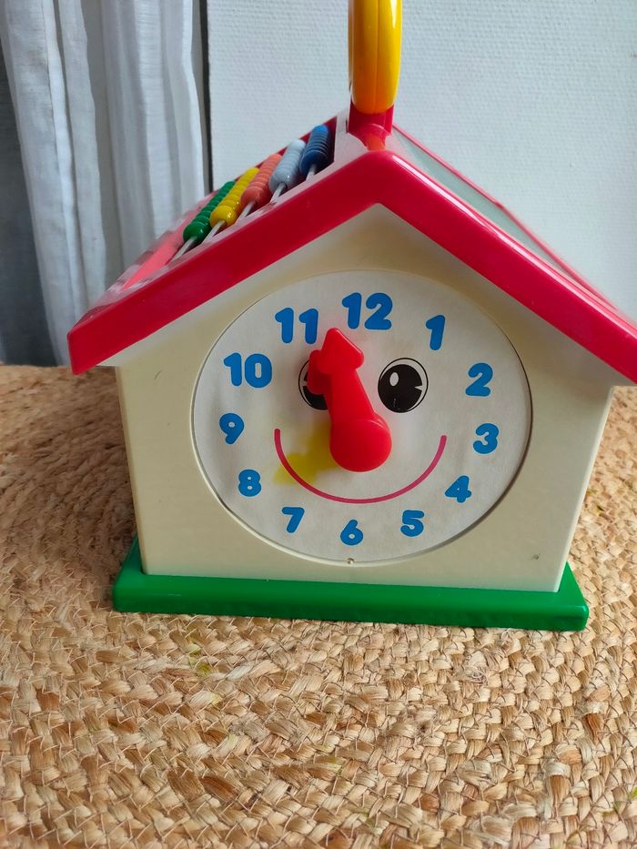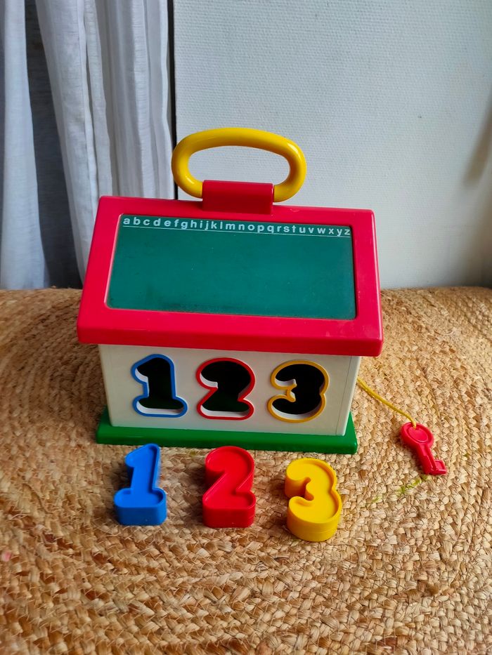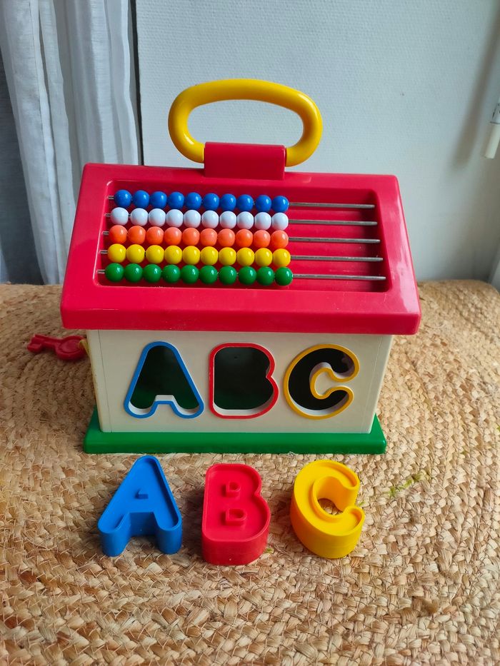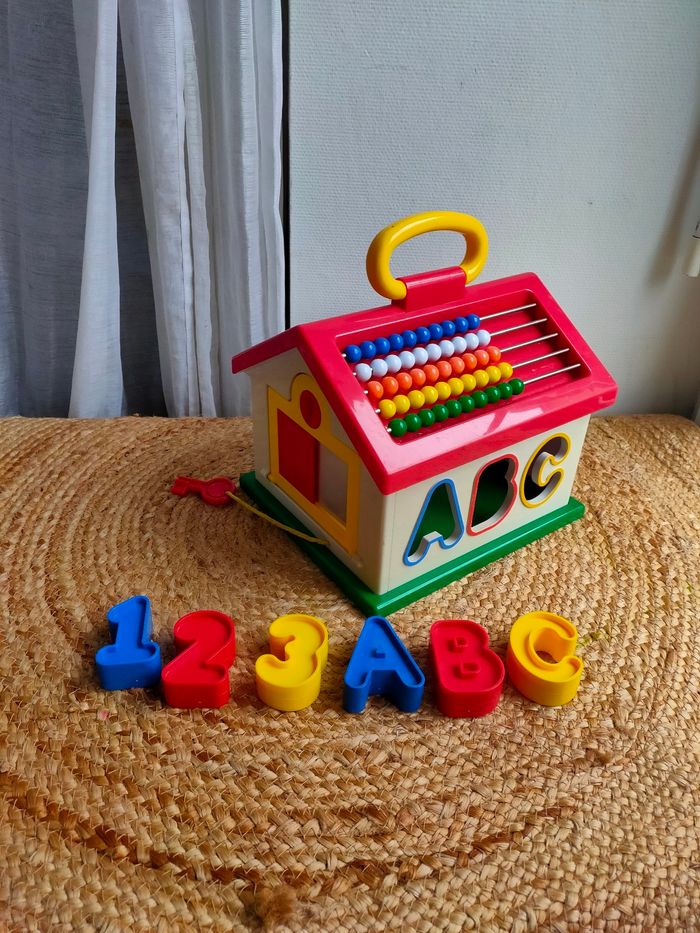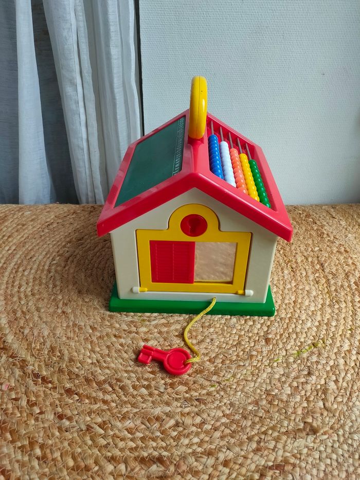 Maison d'activitées d'éveil Vintage, l'enfant pourra jouer avec le boulier sur un pan du toit, alphabet et ardoise sur l’autre pan, jeu d'encastrement avec les Formes ( 1, 2 3 et A, B , C ), porte munie d’un miroir et d’un volet qui peut s'ouvrir avec une grosse clé ainsi qu'une Horloge avec aiguilles mobiles .