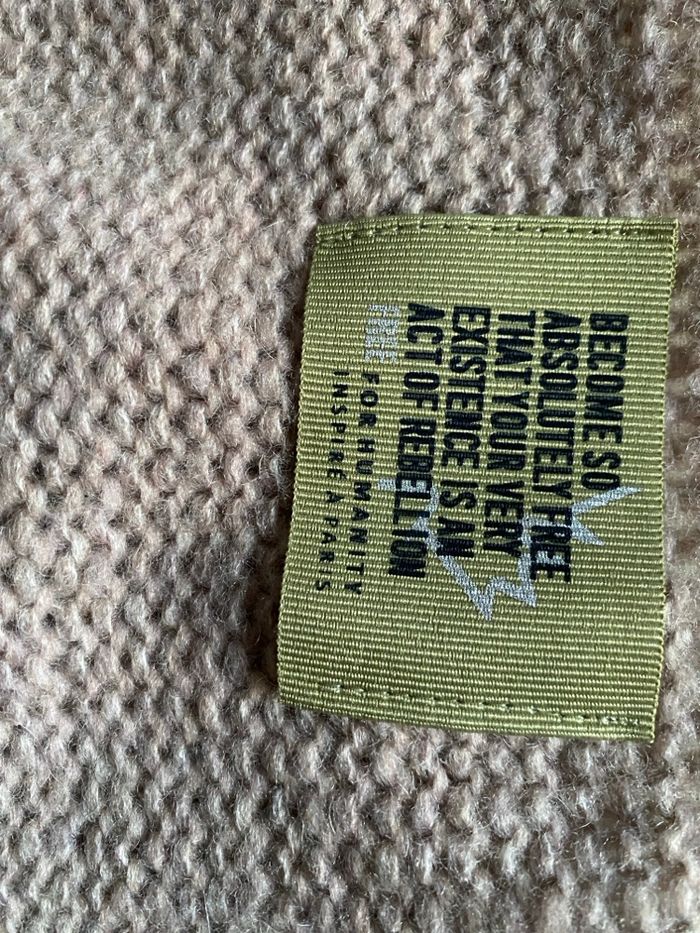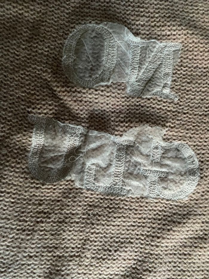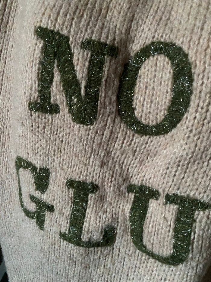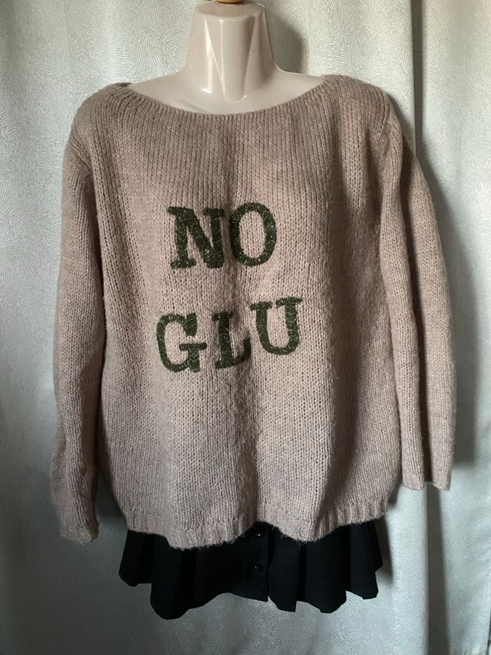 Pull laine mohair rose poudré Inscription devant no glu kaki pailleté Argent taille M 45% mohair 35% laine 20% polyamide Carrure 47 cm Aisselle à aisselle 58 cm Longueur 59,7 cm