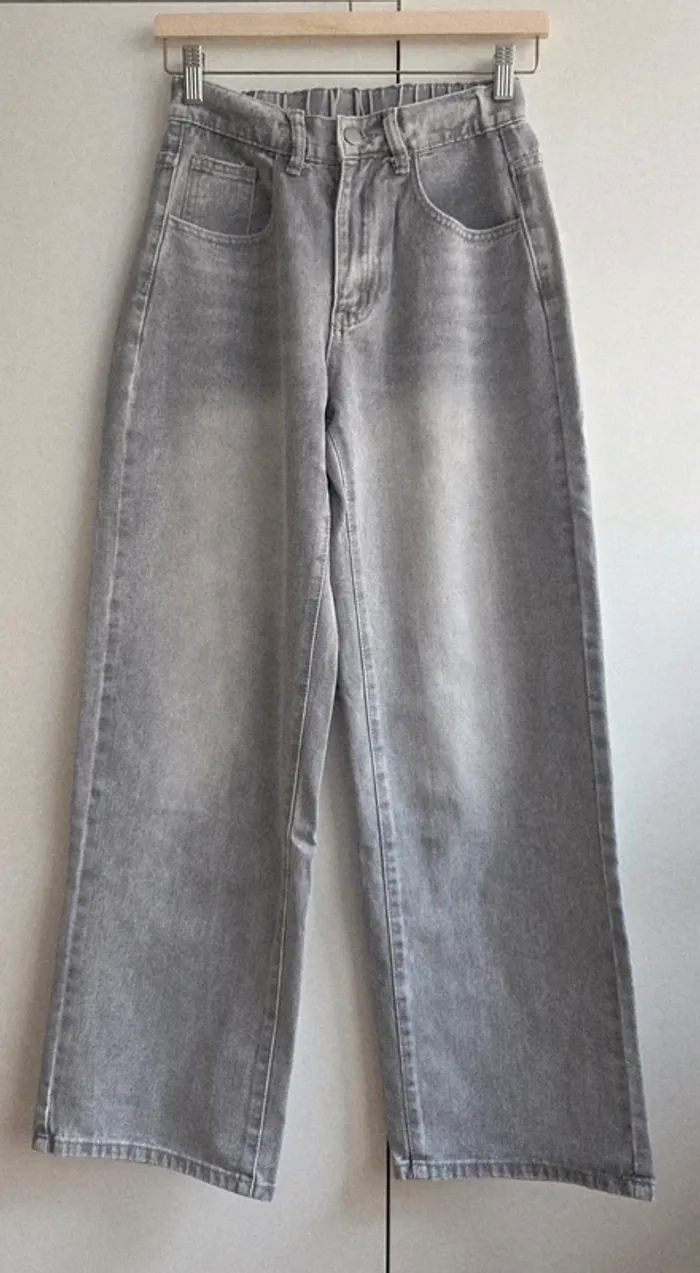 Jean taille XS, forme ample, 87% coton, 7% polyester, 6% viscose. Couleur gris, 3 poches avant dont 1 poche ticket, 2 poches arrière, passant pour ceinture. Longueur: 100 cm