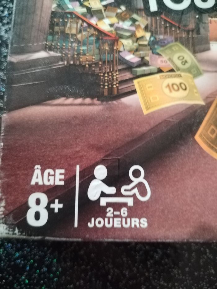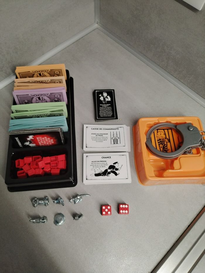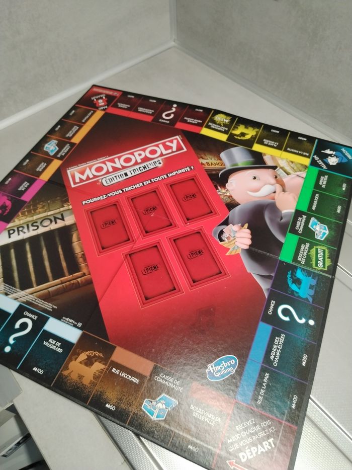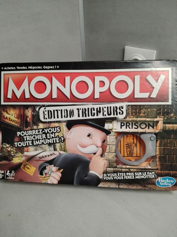 Vend jeu complet du Monopoly édition tricheurs. A partir de 8 ans. Comprenant : le plateau de jeu, bracelet de menottes en plastique,6 pions,22 cartes de propriété,15 cartes triche,16 cartes chance,16 cartes caisse de communauté, 16 hôtels,2 dès,liasse de billets et le plateau de banque. Jeu en très bon état. 1 coin de la boîte abîmée.